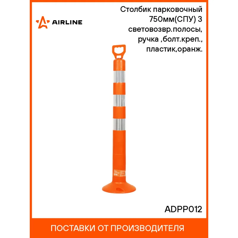 Столбик парковочный 750мм(СПУ) 3 световозвр.полосы, ручка(ухо),болт.креп., пластик,оранж. Описание: Столбик используется, как ограждение при проведении дорожно-строительных работ или для обозначения парковочных мест, перераспределения транспортных потоков, для обозначения аварийных участков и мест ДТП и т.п. Столбик изготовлен из экологически безопасного специализированного полимерного композита ярко оранжевого цвета и оснащен светоотражающими полосами, делающими его заметным в темное время. Используется вместе с утяжелительной подставкой(в комплект не входит), которая приобретается отдельно. Являются заменителем сломавшегося переносного столбика с утяжелителем (ADPP006). Оснащен верхней металлической ручкой для возможной переноски и за которую зацепляется оградительная цепочку или лента. Применение: Дорожно-ремонтные работы; Парковки; Разделения полос движения; Отделения пешеходных зон; Аэропорты; Торговые центры. Имеет 3 отверстия -10,2 мм в основании. Рекомендуемый крепеж - анкерный болт М8 12х100 Характеристики: Артикул: ADPP012 Цвет: оранжевый Высота, мм: 750 Вид: Упругий, с ручкой (ухом) Форма основания: круг Размер основания, мм: 200 Мин. температура эксплуатации, °С: -30 Кол-во полос, шт: 3 Высота полосы, мм: 50 Диаметр столбика, мм: 70 Макс. температура эксплуатации, °С: 50 Диаметр креп. отверстий: 10 мм Количество отверстий: 3 Комплектация: Столбик с наклейкой - 1 шт Гарантия: от 1 года.