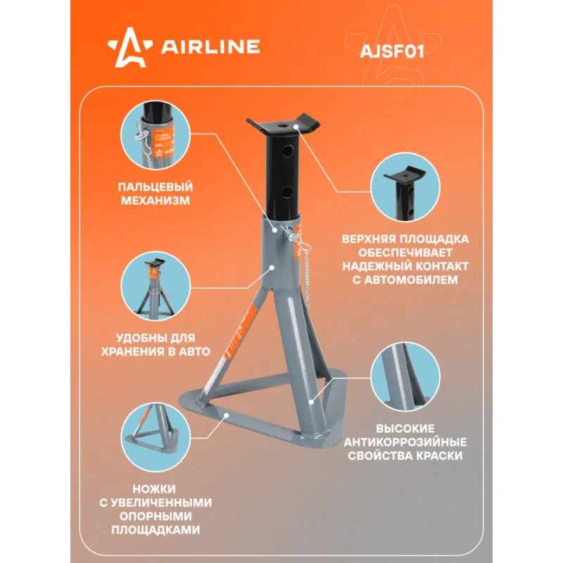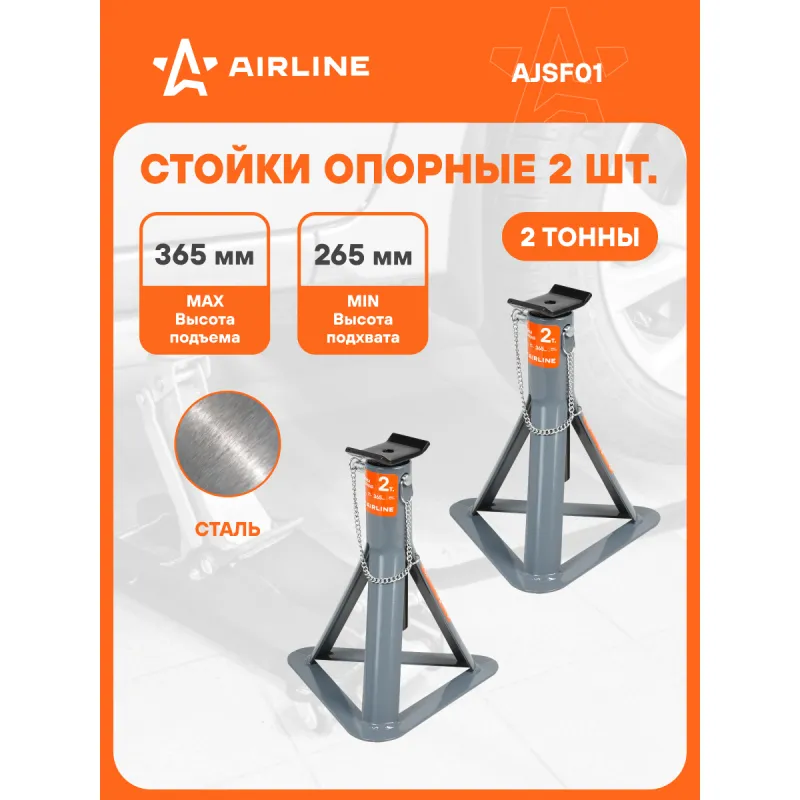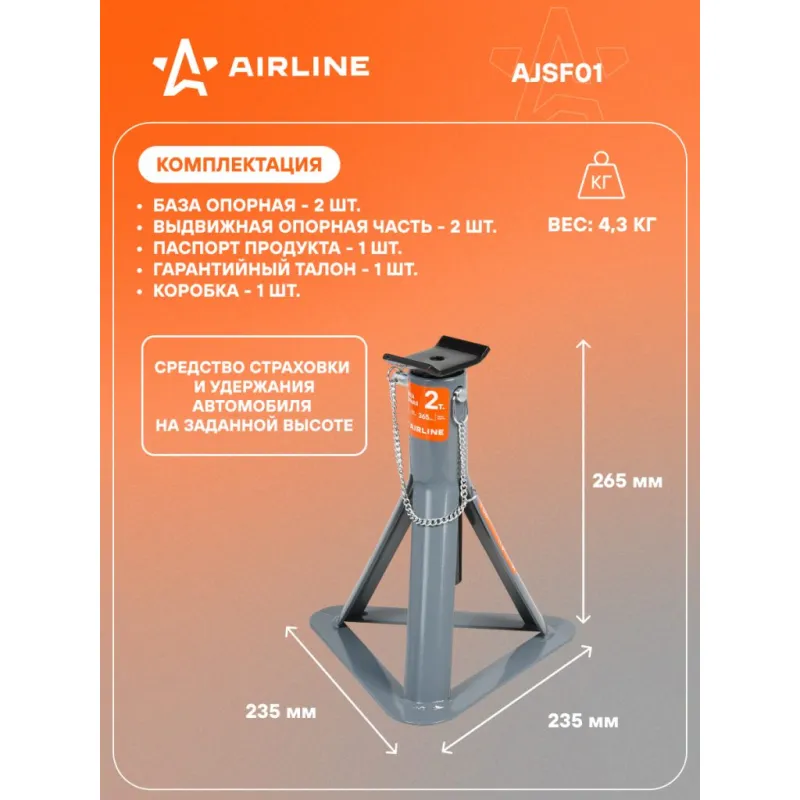 Стойка опорная 2т 265-365мм, пальцевый механизм, 2 шт. Описание: Стойка страховочная для автомобиля 2 шт MIN-265 мм, MAX-365 мм, 2 т AIRLINE AJSF01 применяется как средство страховки и удержания автомобиля на заданной высоте. Стойки устанавливаются под автомобиль в определенных точках (под осями или под специальными площадками на раме). Фиксация производится с помощью пальцевого механизма. В комплекте 2 стойки. Преимущества: - Высота подхвата, 265 мм; - Высота подъема, 365 мм; - Состав: сталь, чугун; - Пальцевый механизм; - Высокие антикоррозийные свойства краски; - Ножки конструкции с увеличенными опорными площадками; - Верхняя площадка обеспечивает надежный контакт с автомобилем; - Удобны для хранения в авто; Характеристики: Артикул: AJSF01 Грузоподъемность, т: 2 Высота подхвата, мм: 265 Высота подъема, мм: 365 Комплектация: База опорная - 2 шт Выдвижная опорная часть - 2 шт Паспорт продукта - 1 шт Гарантийный талон - 1 шт Коробка - 1 шт Гарантия: от 1 года.