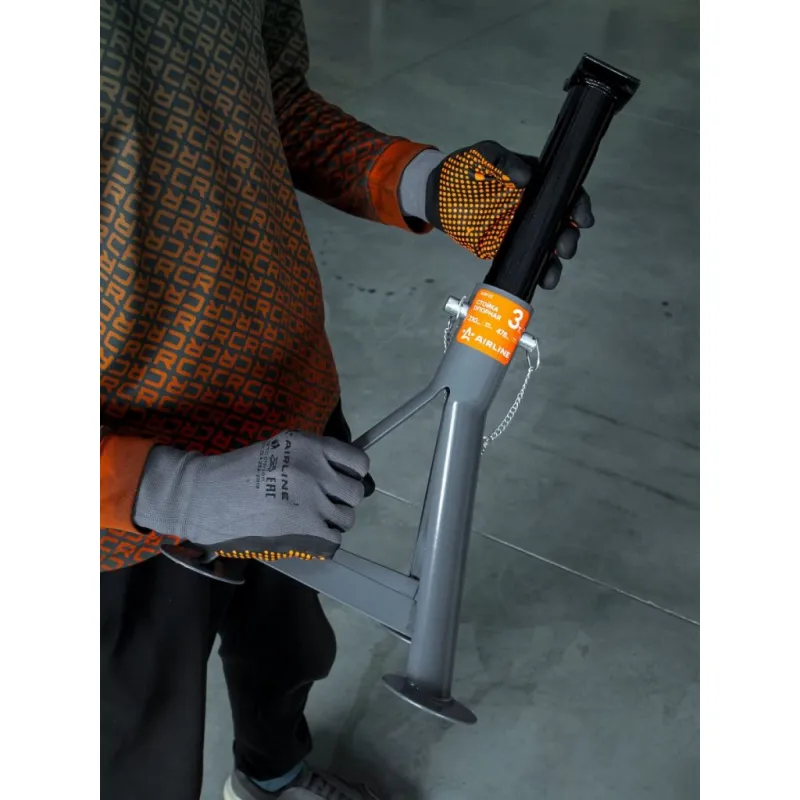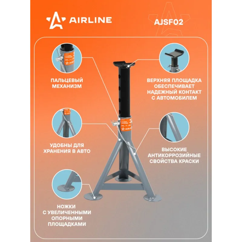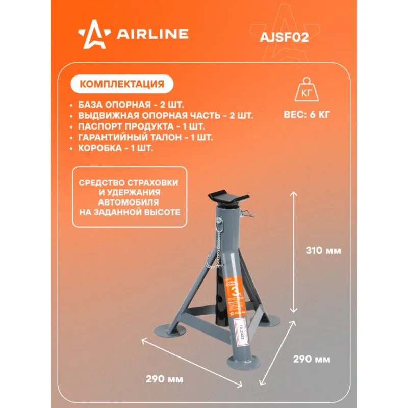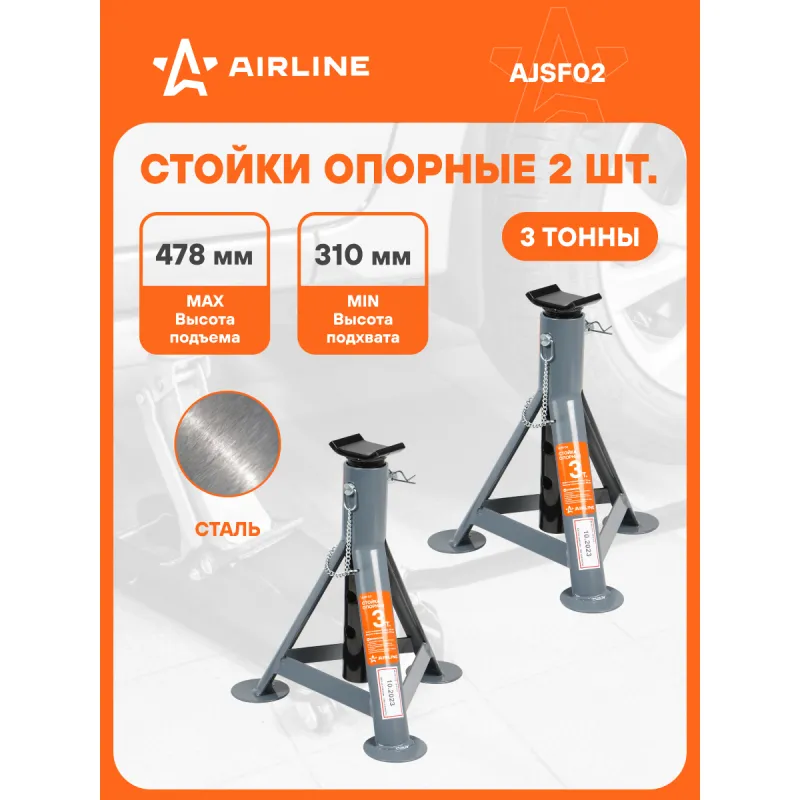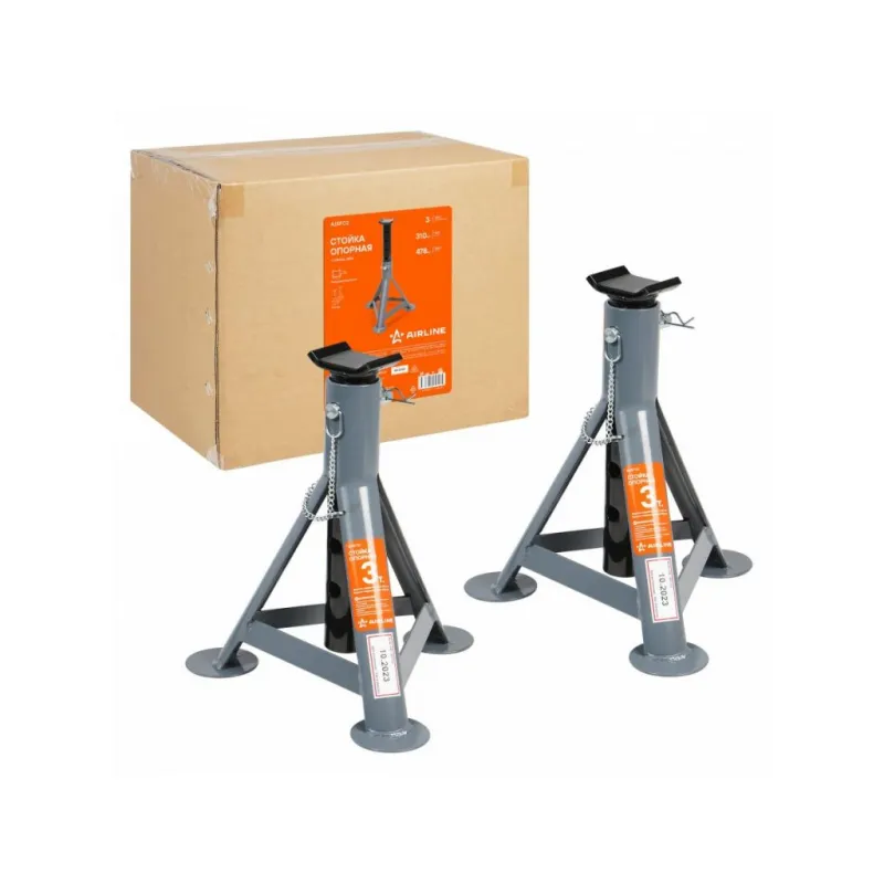 Стойка опорная 3т 310-478мм, пальцевый механизм, 2 шт. Описание: Стойка страховочная для автомобиля 2 шт MIN-310 мм, MAX-478 мм, 3 т AIRLINE AJSF02 применяется как средство страховки и удержания автомобиля на заданной высоте. Стойки устанавливаются под автомобиль в определенных точках (под осями или под специальными площадками на раме). Фиксация производится с помощью пальцевого механизма. В комплекте 2 стойки. Преимущества: - Высота подхвата, 310 мм; - Высота подъема, 478 мм; - Состав: сталь, чугун; - Пальцевый механизм; - Высокие антикоррозийные свойства краски; - Ножки конструкции с увеличенными опорными площадками; - Верхняя площадка обеспечивает надежный контакт с автомобилем; - Удобны для хранения в авто; Характеристики: Артикул: AJSF02 Грузоподъемность, т: 3 Высота подхвата, мм: 310 Высота подъема, мм: 478 Комплектация: База опорная - 2 шт Выдвижная опорная часть - 2 шт Паспорт продукта - 1 шт Гарантийный талон - 1 шт Коробка - 1 шт Гарантия: от 1 года.