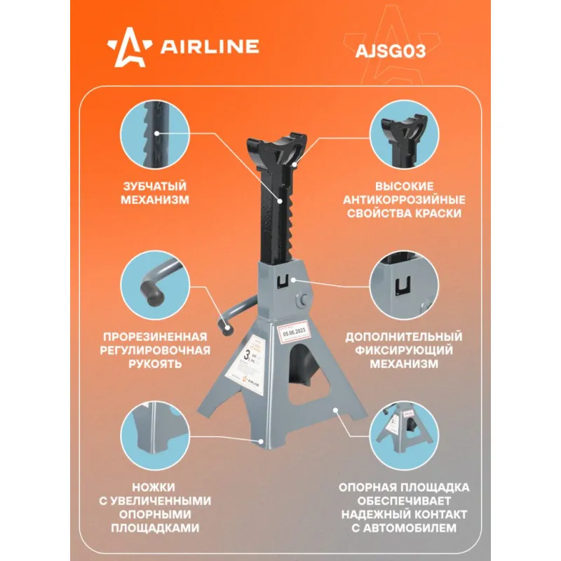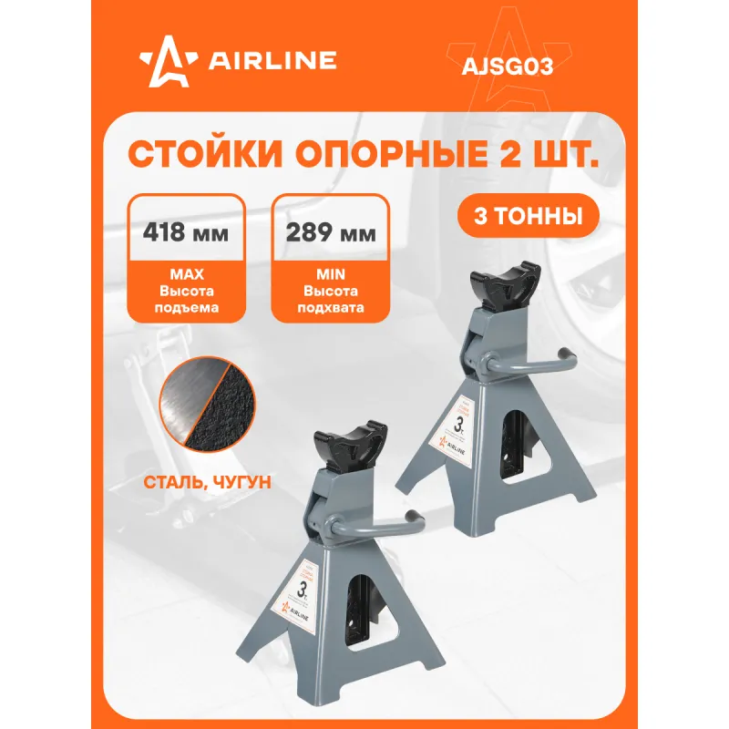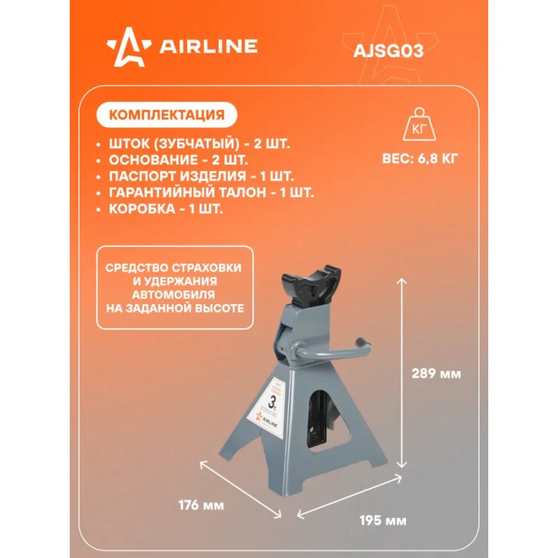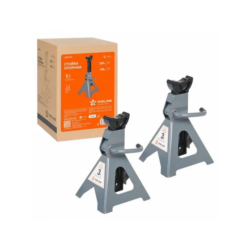 Стойка опорная 3т 289-418мм, зубчатый механизм, 2 шт. Описание: Стойка страховочная для автомобиля 2 шт MIN-289 мм, MAX-418 мм, 3 т AIRLINE AJSG03 применяется как средство страховки и удержания автомобиля на заданной высоте. Стойки опорные подставляются под автомобиль в определенных точках (под осями или под специальными площадками на раме) и удерживают его на выбранном уровне. Простой и удобный в использовании зубчатый механизм, надежно регулирует и фиксирует авто. В комплекте находится 2 стойки. Преимущества: - Высота подхвата, 289 мм; - Высота подъема, 418 мм; - Состав: сталь, чугун; - Зубчатый механизм; - Прорезиненная регулировочная рукоять; - Высокие антикоррозийные свойства краски; - Опорная площадка обеспечивает надежный контакт с автомобилем; - Дополнительный фиксирующий механизм; - Ножки конструкции с увеличенными опорными площадка; Характеристики: Артикул: AJSG03 Грузоподъемность, т: 3 Высота подхвата, мм: 289 Высота подъема, мм: 418 Комплектация: Шток (зубчатый) - 2 шт Основание - 2 шт Паспорт изделия - 1 шт Гарантийный талон - 1 шт Коробка - 1 шт Гарантия: от 1 года.