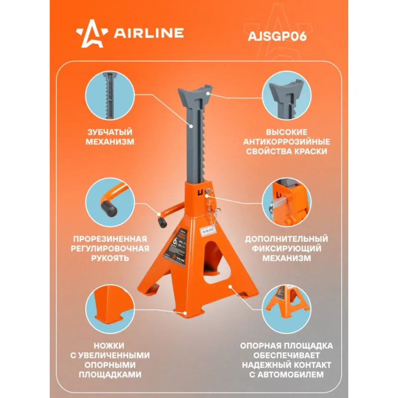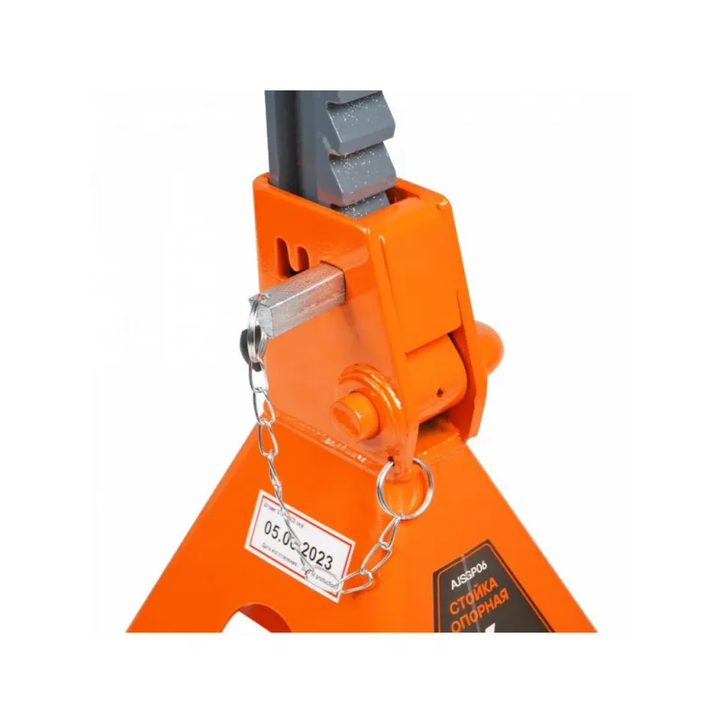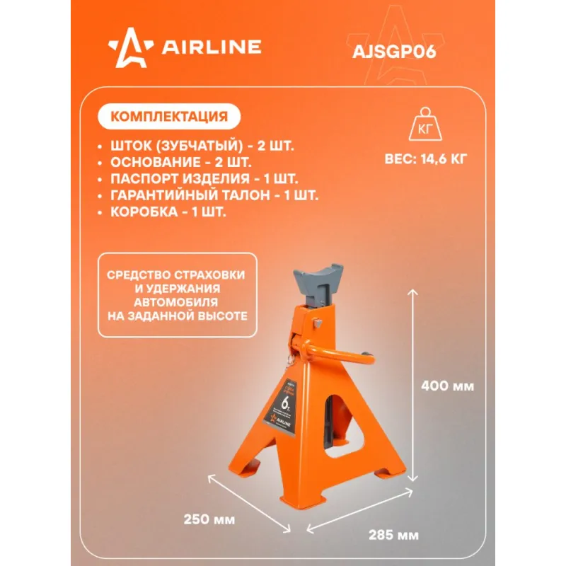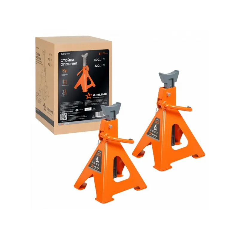 Стойка опорная 6т 400-620мм PRO, зубчатый механизм, доп.фиксатор, 2 шт. Описание: Стойка страховочная для автомобиля Pro 2 шт MIN-400 мм, MAX-620 мм, 6 т AIRLINE AJSGP06 применяется как средство страховки и удержания автомобиля на заданной высоте. Благодаря улучшенной конструкции стойки, а именно дополнительному удерживающему механизму (пальцевый) и увеличенной опорной площадки для дополнительной устойчивости, становится надежной при удержании автомобиля. Стойки подставляют под авто в определенных точках (под осями или под специальными площадками на раме) и удерживают его на выбранном уровне. Простой и удобный в использовании зубчатый механизм, надежно регулирует и фиксирует машину. В комплекте находится 2 стойки и 2 резиновые насадки. Преимущества: - Высота подхвата, 400 мм; - Высота подъема, 620 мм; - Состав: сталь, чугун; - Зубчатый механизм; - Прорезиненная регулировочная рукоять; - Высокие антикоррозийные свойства краски; - Ножки конструкции с увеличенными опорными площадками; - Дополнительный удерживающий механизм; Характеристики: Артикул: AJSGP06 Грузоподъемность, т: 6 Высота подхвата, мм: 400 Высота подъема, мм: 620 Комплектация: Шток (зубчатый) - 2 шт Основание - 2 шт Паспорт изделия - 1 шт Гарантийный талон - 1 шт Коробка - 1 шт Гарантия: от 1 года.