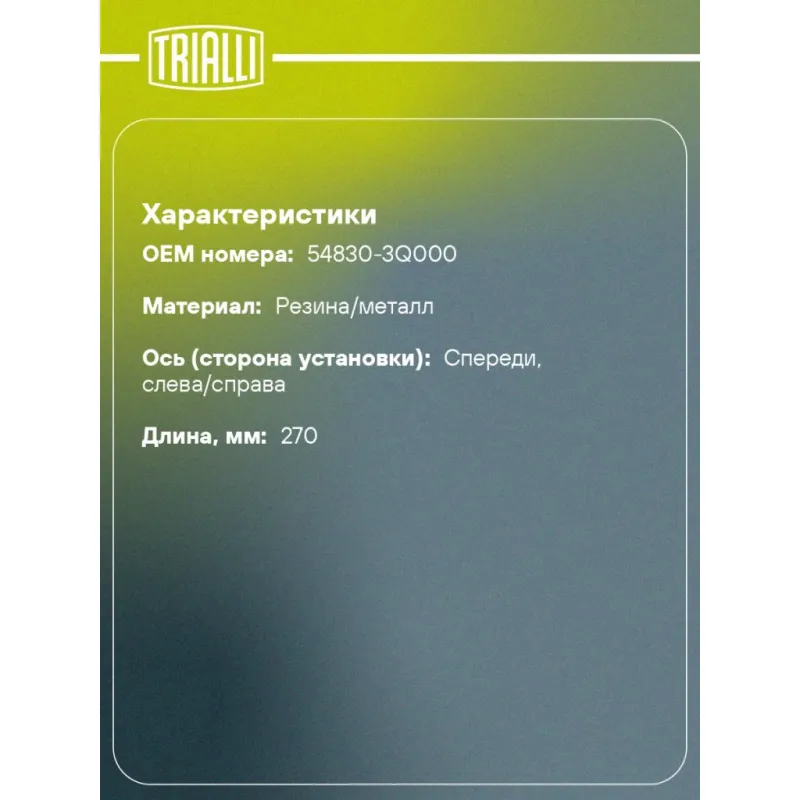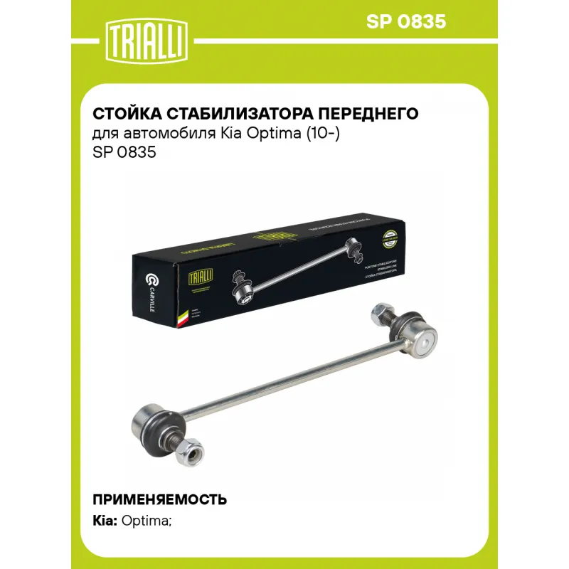 Стойка стабилизатора переднего для автомобиля Kia Optima (10-) Характеристики: Артикул: SP 0835 OEM номера: 54830-3Q000 Товарная линейка: BLACK Количество на автомобиль: 2 Материал: Резина/металл Гарантийный срок: 1 год/30 000 км Ось (сторона установки): Спереди, слева/справа Длина, мм.: 270 Подходит для авто: Kia Optima (11-) Для проверки применяемости отправьте VIN автомобиля через вкладку "Есть вопросы о товаре?" Комплектация: Гайка - 2 шт Стойка стабилизатора - 1 шт Гарантия: от 1 года.