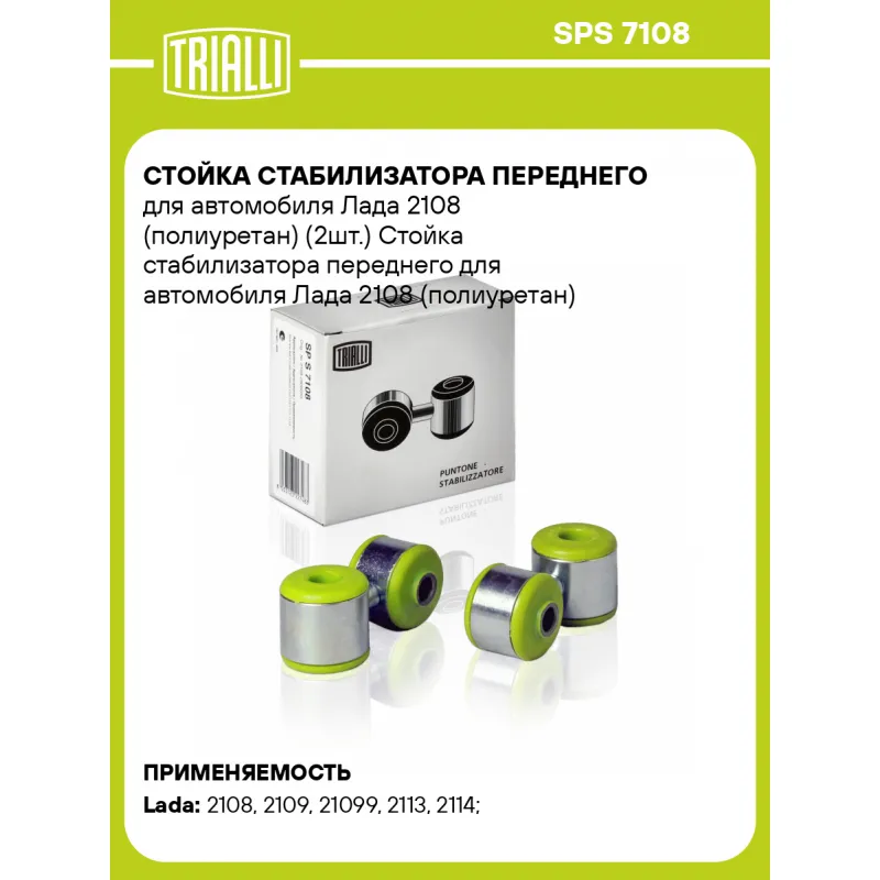 Стойка стабилизатора переднего для автомобиля Лада 2108 (полиуретан) (2шт.) Характеристики: Артикул: SPS 7108 OEM номера: 2108-2906050, 21080-2906050-00 Товарная линейка: BLACK Материал: Сталь/полиуретан Гарантийный срок: 1 год/30 000 км Ось (сторона установки): Спереди, слева/справа Внутренний диаметр, мм: 16 Длина, мм: 88 Количество деталей в артикуле, шт.: 2 Подходит для авто: ВАЗ 2108, 2109, 21099, 2113, 2114, 2115, 1111 (Ока), 2108, 2109, 21099 Для проверки применяемости отправьте VIN автомобиля через вкладку "Есть вопросы о товаре?" Комплектация: Стойка стабилизатора - 2 шт Гарантия: от 1 года.