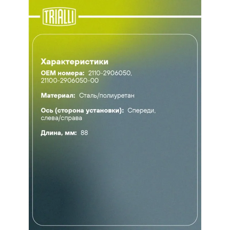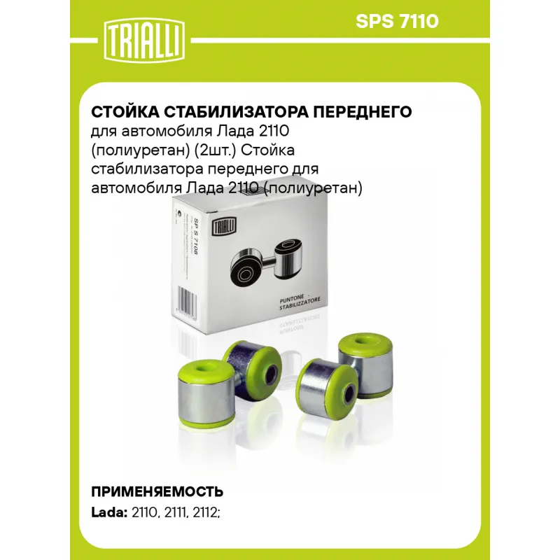 Стойка стабилизатора переднего для автомобиля Лада 2110 (полиуретан) (2шт.) Характеристики: Артикул: SPS 7110 OEM номера: 2110-2906050, 21100-2906050-00 Товарная линейка: BLACK Материал: Сталь/полиуретан Гарантийный срок: 1 год/30 000 км Ось (сторона установки): Спереди, слева/справа Внутренний диаметр, мм: 18 Длина, мм: 88 Количество деталей в артикуле, шт.: 2 Подходит для авто: ВАЗ 2110, 2110, 2111, 2112 Для проверки применяемости отправьте VIN автомобиля через вкладку "Есть вопросы о товаре?" Комплектация: Стойка стабилизатора - 2 шт Гарантия: от 1 года.