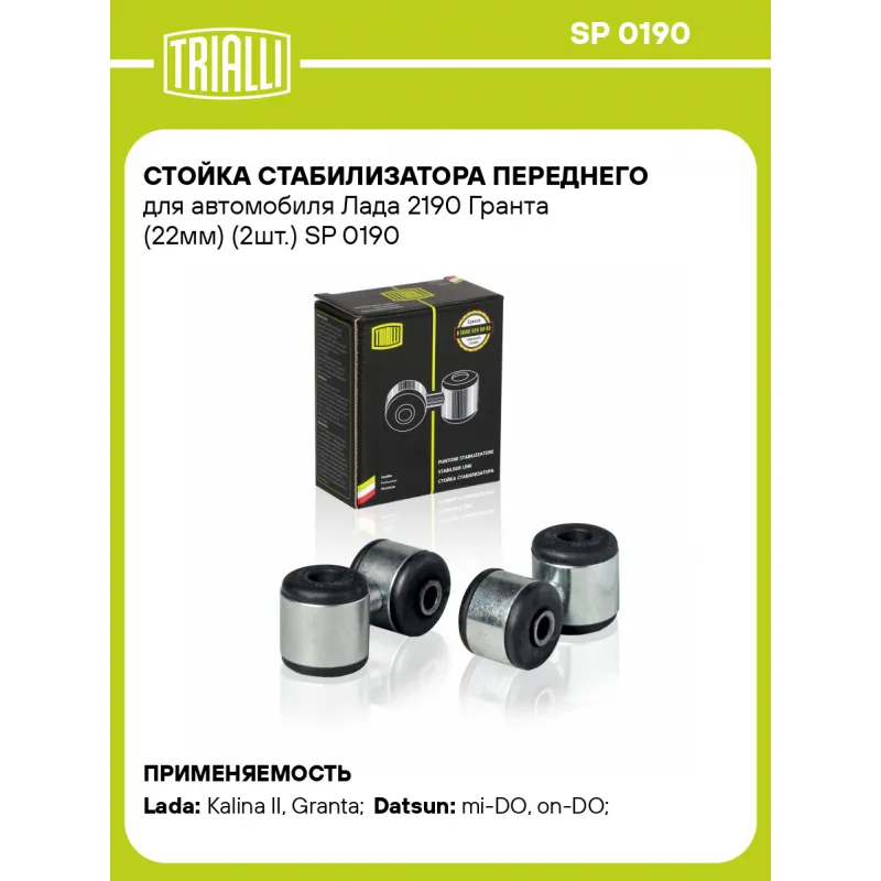 Стойка стабилизатора переднего для автомобиля Лада 2190 Гранта (22мм) (2шт.) Характеристики: Артикул: SP 0190 OEM номера: 2190-2906050 Товарная линейка: BLACK Количество на автомобиль: 1 Материал: Сталь/резина Гарантийный срок: 1 год/30 000 км Ось (сторона установки): Спереди, слева/справа Внутренний диаметр, мм: 22 Длина, мм: 88 Количество деталей в артикуле, шт.: 2 Подходит для авто: ВАЗ Kalina II (13-), Granta (10-) Datsun mi-DO (15-), on-DO (14-) Для проверки применяемости отправьте VIN автомобиля через вкладку "Есть вопросы о товаре?" Комплектация: Стойка стабилизатора - 2 шт Гарантия: от 1 года.
