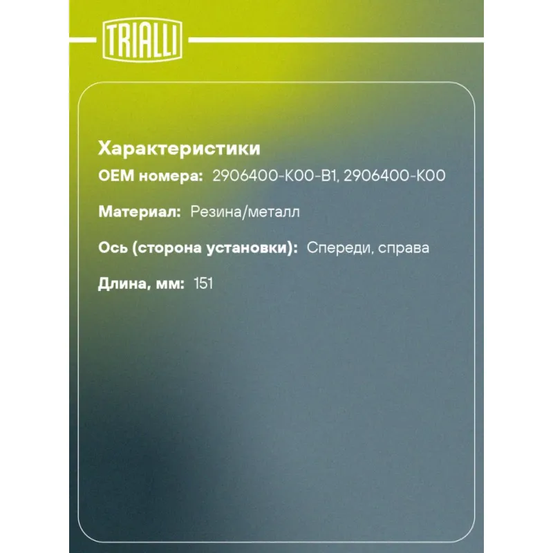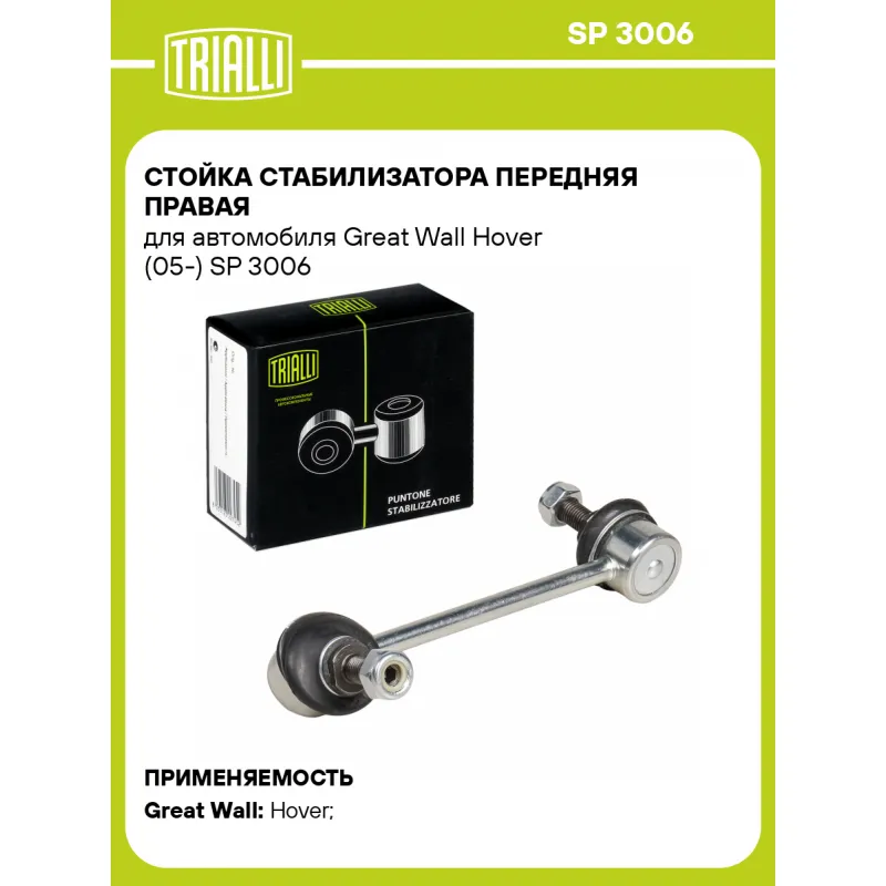 Стойка стабилизатора передняя правая для автомобиля Great Wall Hover (05-) Характеристики: Артикул: SP 3006 OEM номера: 2906400-K00-B1, 2906400-K00 Товарная линейка: BLACK Парный товар: SP 3005 Количество на автомобиль: 1 Материал: Резина/металл Гарантийный срок: 1 год/30 000 км Ось (сторона установки): Спереди, справа Длина, мм.: 151 Подходит для авто: Great Wall Hover (05-) Для проверки применяемости отправьте VIN автомобиля через вкладку "Есть вопросы о товаре?" Комплектация: Стойка стабилизатора - 1 шт Гайка - 2 шт Гарантия: от 1 года.