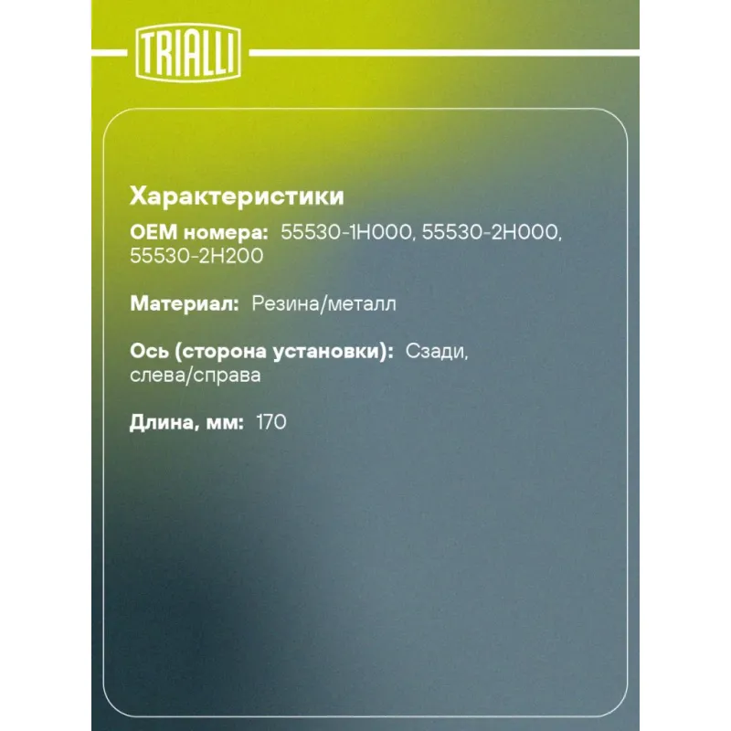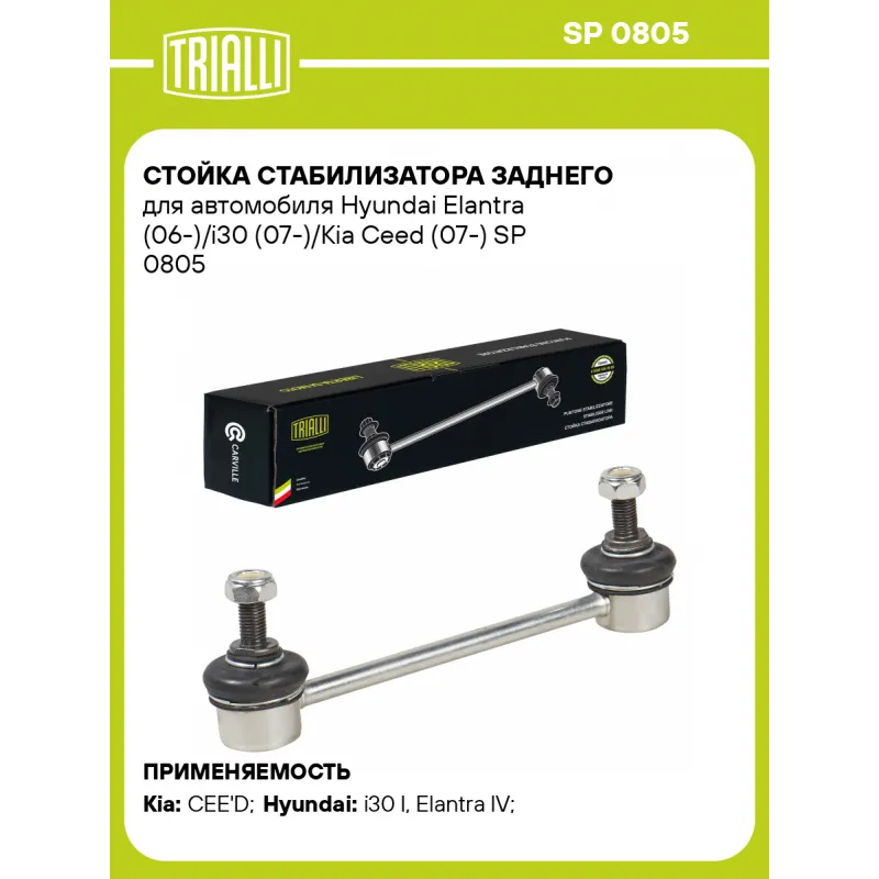 Стойка стабилизатора заднего для автомобиля Hyundai Elantra (06-)/i30 (07-)/Kia Ceed (07-) Характеристики: Артикул: SP 0805 OEM номера: 55530-1H000, 55530-2H000, 55530-2H200 Товарная линейка: BLACK Количество на автомобиль: 2 Материал: Резина/металл Гарантийный срок: 1 год/30 000 км Ось (сторона установки): Сзади, слева/справа Длина, мм: 170 Подходит для авто: Kia CEE'D (07-) Hyundai i30 I (07-), Elantra IV (06-) Для проверки применяемости отправьте VIN автомобиля через вкладку "Есть вопросы о товаре?" Комплектация: Стойка стабилизатора - 1 шт Гайка - 2 шт Гарантия: от 1 года.