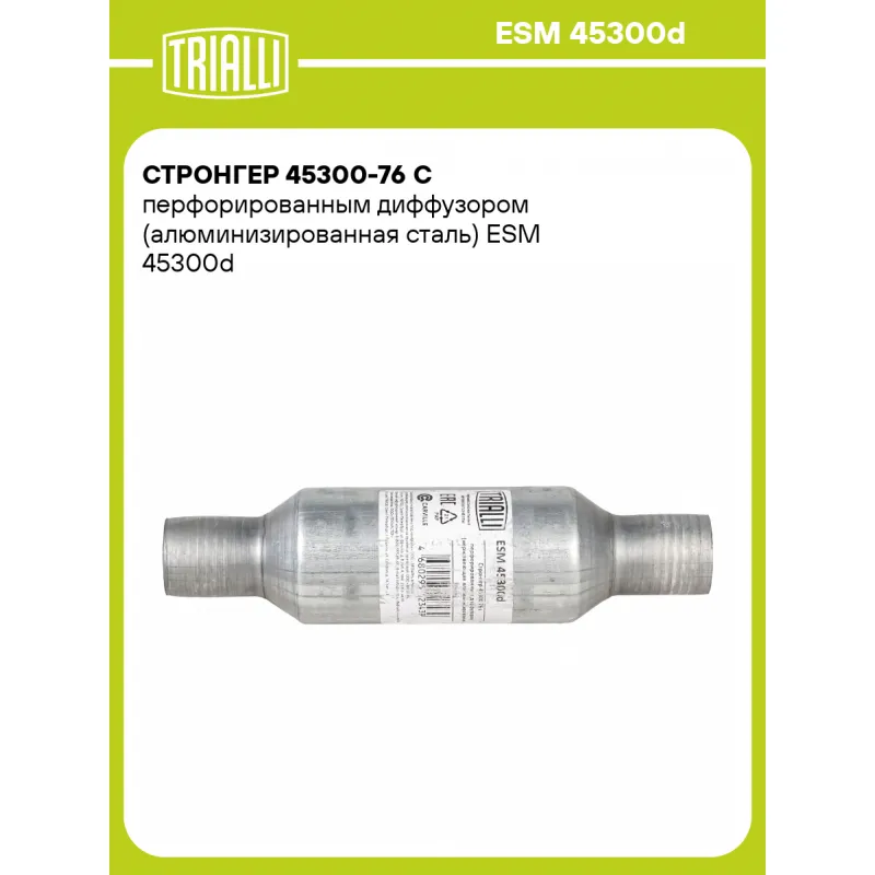 Стронгер 45300-76 с перфорированным диффузором (алюминизированная сталь) Характеристики: Артикул: ESM 45300d OEM номера: STAL128 Количество на автомобиль: 1 Длина, мм: 300 Особенности конструкции:: Перфорированный диффузор и шумопоглощающий материал Диаметр корпуса, мм: 76 Диаметр трубы (мм): 45 Материал: Алюминизированная сталь... Читать полностью →