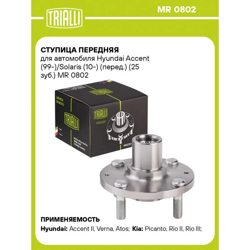 Ступица передняя для автомобиля Hyundai Accent (99-)/Solaris (10-) (перед.) (25 зуб.) Характеристики: Артикул: MR 0802 OEM номера: 51750-25001, 51750-25000 Товарная линейка: BLACK Количество на автомобиль: 2 Подходящая гайка колесная AIRLINE:: ASCR001, ASCR002, ASCR004, ASCR011, ASCR024, ASCR027, ASCR033 Подходящая шпилька колесная AIRLINE:: ASTD001, ASTD002, ASTD005 Сторона установки: Спереди, слева/справа Высота, мм: 74 Внутренний диаметр, мм: 38 Внешний диаметр, мм: 62 Особенности конструкции:: Без подшипника Количество зубьев: 25 Сопутствующие товары: Ремонтные комплекты ступицы: CS 0873 Гарантийный срок: 2 года/60 000 км Крепление колёсного диска: M12x1,5 Разболтовка (PCD):: 4x100 Сопутствующие товары:: CS 0873 Разболтовка (PCD): 4-M12x1.5-100 Подходит для авто: Hyundai Accent II (99-), Accent II (TagAZ) (01-), Verna (06-), Atos (98-), Coupe I (96-), i10 (07-), i10 (07-), i20 (08-), i20 (08-), Lantra II (95-), Getz (02-), Solaris I (10-) Kia Picanto (04-), Rio II (05-), Rio III (11-) Для проверки применяемости отправьте VIN автомобиля через вкладку "Есть вопросы о товаре?" Комплектация: Ступица - 1 шт Гарантия: от 1 года.