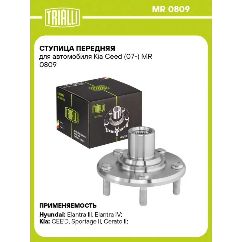 Ступица передняя для автомобиля Kia Ceed (07-) Характеристики: Артикул: MR 0809 OEM номера: 51750-2H000 Товарная линейка: BLACK Количество на автомобиль: 2 Подходящая гайка колесная AIRLINE:: ASCR001, ASCR002, ASCR004, ASCR011, ASCR024 Подходящая шпилька колесная AIRLINE:: ASTD001, ASTD002, ASTD005 Сторона установки: Спереди, слева/справа Высота, мм: 80 Внутренний диаметр, мм: 28 Внешний диаметр, мм: 139 Особенности конструкции:: Без подшипника Сопутствующие товары: Ремонтные комплекты ступицы: CS 0870 Гарантийный срок: 2 года/60 000 км Крепление колёсного диска: M12x1,5 Разболтовка (PCD):: 5x114,3 Сопутствующие товары:: CS 0870 Разболтовка (PCD): 5-M12x1.5-114.3 Подходит для авто: Hyundai Elantra III (00-), Elantra IV (06-), Elantra V (11-), i30 I (07-), i30 II (11-) Kia CEE'D (07-), CEE'D (12-), Sportage II (04-), Cerato II (09-) Для проверки применяемости отправьте VIN автомобиля через вкладку "Есть вопросы о товаре?" Комплектация: Ступица - 1 шт Гарантия: от 1 года.