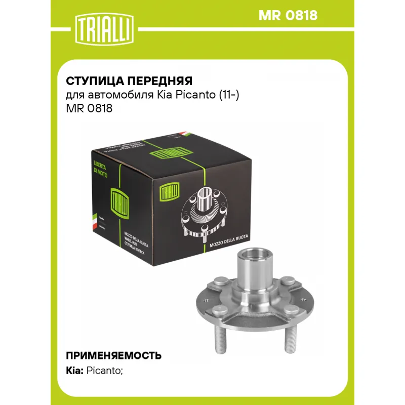 Ступица передняя для автомобиля Kia Picanto (11-) Характеристики: Артикул: MR 0818 OEM номера: 51750-1Y000 Товарная линейка: BLACK Количество на автомобиль: 2 Подходящая гайка колесная AIRLINE:: ASCR001, ASCR002, ASCR011, ASCR024 Подходящая шпилька колесная AIRLINE:: ASTD001, ASTD005 Сторона установки: Спереди, слева/справа Высота, мм: 71 Внутренний диаметр, мм: 36 Внешний диаметр, мм: 121,5 Особенности конструкции:: Без подшипника Количество зубьев: 24 Гарантийный срок: 2 года/60 000 км Крепление колёсного диска: M12x1,5 Разболтовка (PCD):: 4x100 Разболтовка (PCD): 4-M12x1.5-100 Подходит для авто: Kia Picanto (11-) Для проверки применяемости отправьте VIN автомобиля через вкладку "Есть вопросы о товаре?" Комплектация: Ступица - 1 шт Гарантия: от 1 года.