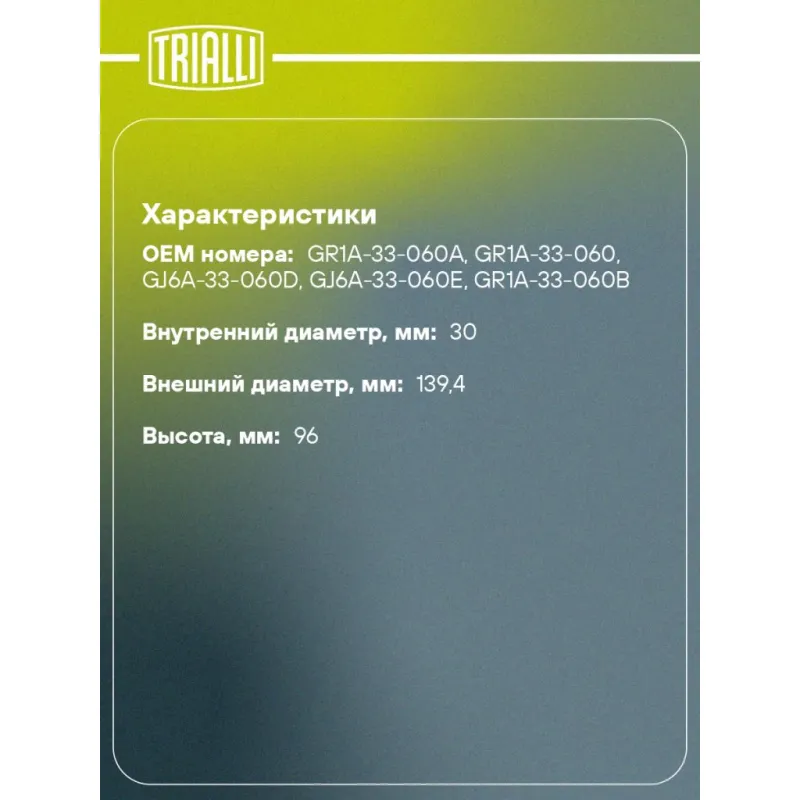 Ступица передняя для автомобиля Mazda 6 (02-) Характеристики: Артикул: MR 2501 OEM номера: GR1A-33-060A, GR1A-33-060, GJ6A-33-060D, GJ6A-33-060E, GR1A-33-060B Товарная линейка: BLACK Количество на автомобиль: 2 Подходящая гайка колесная AIRLINE:: ASCR001, ASCR004, ASCR011 Подходящая шпилька колесная AIRLINE:: ASTD001, ASTD002 Сторона установки: Спереди, слева/справа Высота, мм: 96 Внутренний диаметр, мм: 30 Внешний диаметр, мм: 139,4 Особенности конструкции:: Без подшипника Количество зубьев: 28 Сопутствующие товары: Ремонтные комплекты ступицы: CS 1824 Гарантийный срок: 2 года/60 000 км Крепление колёсного диска: M12x1,5 Разболтовка (PCD):: 5x114,3 Сопутствующие товары:: CS 1824 Разболтовка (PCD): 5-M12x1.5-114.3 Подходит для авто: Mazda 6 (02-), 6 (07-), 6 (02-) Для проверки применяемости отправьте VIN автомобиля через вкладку "Есть вопросы о товаре?" Комплектация: Ступица - 1 шт Гарантия: от 1 года.