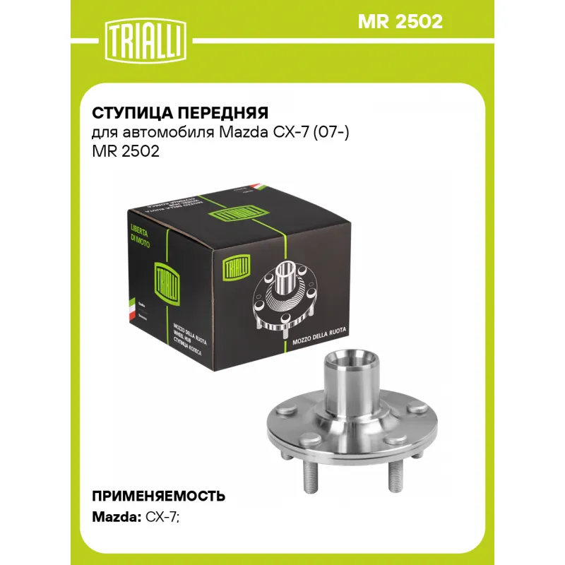 Ступица передняя для автомобиля Mazda CX-7 (07-) Характеристики: Артикул: MR 2502 OEM номера: L206-33-060A Товарная линейка: BLACK Количество на автомобиль: 2 Подходящая гайка колесная AIRLINE:: ASCR001, ASCR011 Подходящая шпилька колесная AIRLINE:: ASTD001, ASTD002 Сторона установки: Спереди, слева/справа Высота, мм: 77,5 Внутренний диаметр, мм: 45 Внешний диаметр, мм: 140 Особенности конструкции:: Без подшипника Количество зубьев: 31 Сопутствующие товары: Ремонтные комплекты ступицы: CS 2571 Гарантийный срок: 2 года/60 000 км Крепление колёсного диска: M12x1,5 Разболтовка (PCD):: 5x114,3 Сопутствующие товары:: CS 2571 Разболтовка (PCD): 5-M12x1.5-114.3 Подходит для авто: Mazda CX-7 (07-), CX-7 (07-) Для проверки применяемости отправьте VIN автомобиля через вкладку "Есть вопросы о товаре?" Комплектация: Ступица - 1 шт Гарантия: от 1 года.