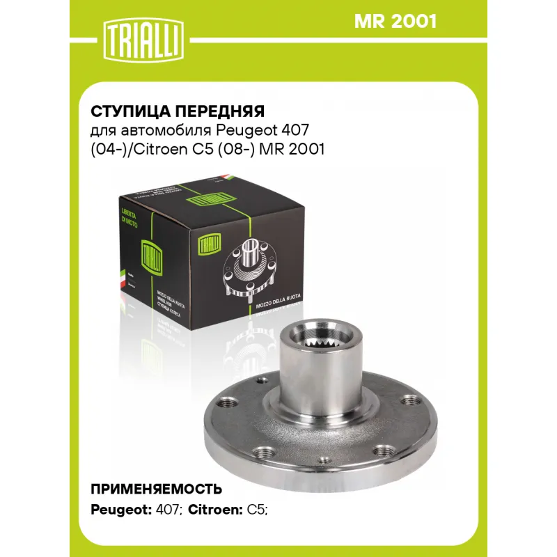Ступица передняя для автомобиля Peugeot 407 (04-)/Citroen C5 (08-) Характеристики: Артикул: MR 2001 OEM номера: 3307.80 Товарная линейка: BLACK Количество на автомобиль: 2 Подходящий болт колесный AIRLINE:: ABLT007 Сторона установки: Спереди, слева/справа Высота, мм: 78,5 Внутренний диаметр, мм: 45 Внешний диаметр, мм: 129,5 Особенности конструкции:: Без подшипника Количество зубьев: 28 Гарантийный срок: 2 года/60 000 км Крепление колёсного диска: M12x1,25 Разболтовка (PCD):: 5x108 Разболтовка (PCD): 5-M12x1.25-108 Подходит для авто: Peugeot 407 (04-), 407 (04-) Citroen C5 (08-), C5 (08-) Для проверки применяемости отправьте VIN автомобиля через вкладку "Есть вопросы о товаре?" Комплектация: Ступица - 1 шт Гарантия: от 1 года.