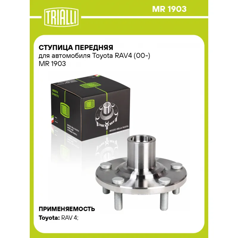 Ступица передняя для автомобиля Toyota RAV4 (00-) Характеристики: Артикул: MR 1903 OEM номера: 43502-33020, 43502-42020 Товарная линейка: BLACK Количество на автомобиль: 2 Подходящая гайка колесная AIRLINE:: ASCR001, ASCR002, ASCR004, ASCR005, ASCR009 Подходящая шпилька колесная AIRLINE:: ASTD002, ASTD008 Сторона установки: Спереди, слева/справа Высота, мм: 76,5 Внутренний диаметр, мм: 43 Внешний диаметр, мм: 139 Особенности конструкции:: Без подшипника Количество зубьев: 26 Сопутствующие товары: Ремонтные комплекты ступицы: CS 1993 Гарантийный срок: 2 года/60 000 км Крепление колёсного диска: M12x1,5 Разболтовка (PCD):: 5x114,3 Сопутствующие товары:: CS 1993 Разболтовка (PCD): 5-M12x1.5-114.3 Подходит для авто: Toyota RAV 4 (00-), RAV 4 (00-) Для проверки применяемости отправьте VIN автомобиля через вкладку "Есть вопросы о товаре?" Комплектация: Ступица - 1 шт Гарантия: от 1 года.