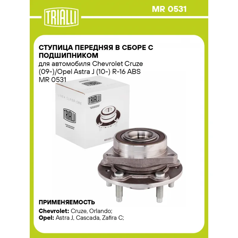 Ступица передняя в сборе с подшипником для автомобиля Chevrolet Cruze (09-)/Opel Astra J (10-) R-16 ABS Характеристики: Артикул: MR 0531 OEM номера: 13502829, 13583479, 3 28 001, 3 28 021, 013583479, 013502829, 00328 021, 0328 021, 0328 001, 00328 001 Товарная линейка: BLACK Количество на автомобиль: 2 Подходящая гайка колесная AIRLINE:: ASCR032 Подходящая шпилька колесная AIRLINE:: ASTD009 Сторона установки: Спереди, слева/справа Высота, мм: 110 Внутренний диаметр, мм: 34 Внешний диаметр, мм: 146 Особенности конструкции:: С подшипником Количество зубьев: 30 Количество креп. отверстий: 3 Гарантийный срок: 1 год/30 000 км Крепление колёсного диска: M12x1,5 Разболтовка (PCD):: 5x115 Разболтовка (PCD): 5-M12x1.5-115 Подходит для авто: Chevrolet Cruze (09-), Cruze (09-), Orlando (10-) Opel Astra J (10-), Cascada (13-), Zafira C (11-), Astra J (10-) Для проверки применяемости отправьте VIN автомобиля через вкладку "Есть вопросы о товаре?" Комплектация: Ступица - 1 шт Гарантия: от 1 года.