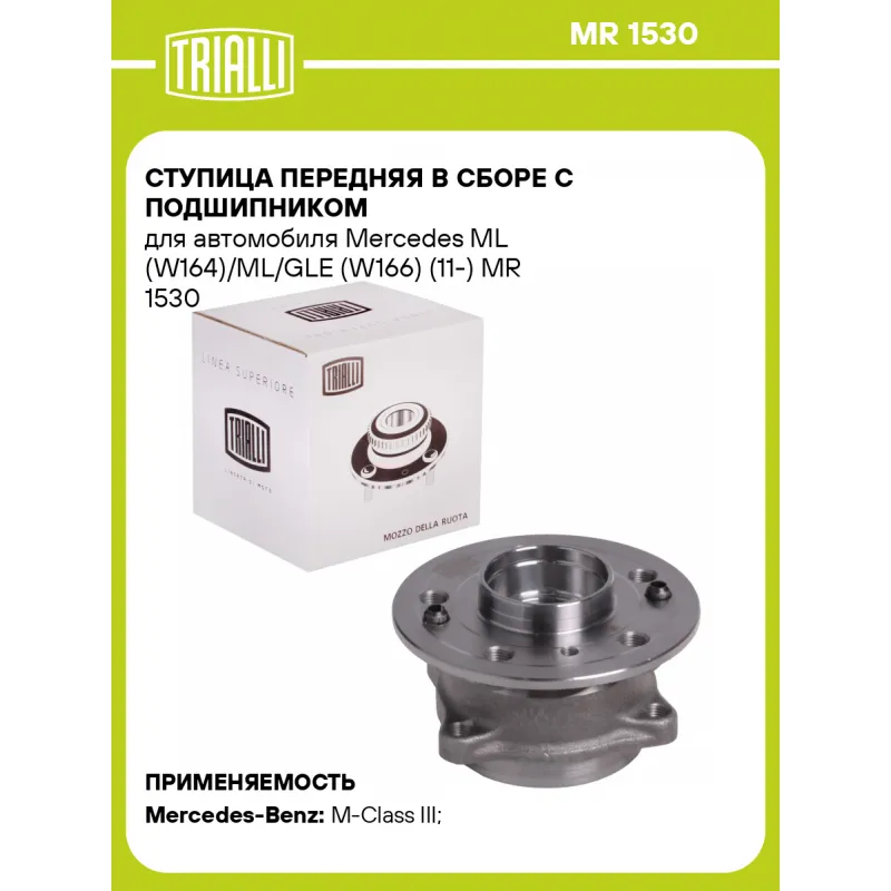 Ступица передняя в сборе с подшипником для автомобиля Mercedes ML (W164)/ML/GLE (W166) (11-) Характеристики: Артикул: MR 1530 OEM номера: A1663340206, 1663340206 Товарная линейка: BLACK Количество на автомобиль: 2 Подходящий болт колесный AIRLINE:: ABLT005, ABLT009, ABLT010 Сторона установки: Спереди, слева/справа Высота, мм: 92,5 Внутренний диаметр, мм: 31 Внешний диаметр, мм: 152 Особенности конструкции:: С подшипником Количество зубьев: 30 Количество креп. отверстий: 4 Гарантийный срок: 1 год/30 000 км Крепление колёсного диска: M14x1,5 Разболтовка (PCD):: 5x112 Разболтовка (PCD): 5-M14x1.5-112 Подходит для авто: Mercedes-Benz M-Class III (W166) (11-), M-Class III (W166) (11-), GL-Class II (X166) (12-) Для проверки применяемости отправьте VIN автомобиля через вкладку "Есть вопросы о товаре?" Комплектация: Ступица - 1 шт Гарантия: от 1 года.