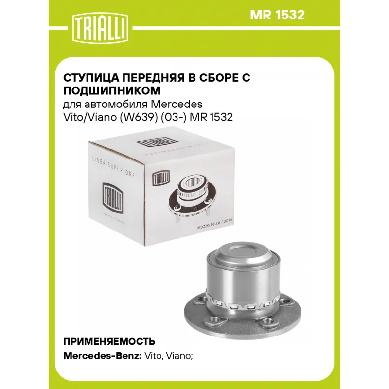 Ступица передняя в сборе с подшипником для автомобиля Mercedes Vito/Viano (W639) (03-) Характеристики: Артикул: MR 1532 OEM номера: A6393300220, A6393300320, A6393300420, A6393300632, A6393300732, A6393301232, 6393301432, 6393301532, 6393301832, 6393301932, 6393300320, 6393300420, 6393300632, 6393300732, 6393301232, 6393301332, A6393301332, A6393301432, A6393301532, A6393301832, A6393301932, 6393300220 Товарная линейка: BLACK Количество на автомобиль: 2 Подходящий болт колесный AIRLINE:: ABLT010 Сторона установки: Спереди, слева/справа Высота, мм: 106,5 Внешний диаметр, мм: 150 Особенности конструкции:: С подшипником Гарантийный срок: 1 год/30 000 км Крепление колёсного диска: M14x1,5 Разболтовка (PCD):: 5x112 Разболтовка (PCD): 5-M14x1.5-112 Подходит для авто: Mercedes-Benz Vito (W639) (03-), Viano (W639) (03-) Для проверки применяемости отправьте VIN автомобиля через вкладку "Есть вопросы о товаре?" Комплектация: Ступица - 1 шт Гарантия: от 1 года.