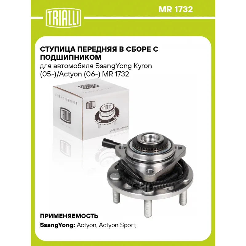 Ступица передняя в сборе с подшипником для автомобиля SsangYong Kyron (05-)/Actyon (06-) Характеристики: Артикул: MR 1732 OEM номера: 41420-09300, 41420-09302, 41420-09400, 41420-09401, 41420-09403, 41420-09404, 41420-21801, 41420-21802, 41431-09000, 41431-09101, 41431-09103, 41432-09001 Товарная линейка: BLACK Количество на автомобиль: 2 Подходящая гайка колесная AIRLINE:: ASCR001, ASCR002 Сторона установки: Спереди, слева/справа Высота, мм: 125,5 Внутренний диаметр, мм: 89 Внешний диаметр, мм: 160 Особенности конструкции:: С подшипником Количество зубьев: 40 Количество креп. отверстий: 3 Гарантийный срок: 1 год/30 000 км Крепление колёсного диска: M14x1,5 Разболтовка (PCD):: 5x130 Разболтовка (PCD): 5-M14x1.5-130 Подходит для авто: SsangYong Actyon (05-), Actyon Sport (05-), Kyron (05-), Rexton (12-), Actyon (05-), Kyron (05-) Для проверки применяемости отправьте VIN автомобиля через вкладку "Есть вопросы о товаре?" Комплектация: Ступица - 1 шт Гарантия: от 1 года.