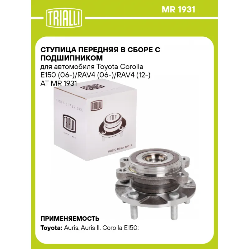 Ступица передняя в сборе с подшипником для автомобиля Toyota Corolla E150 (06-)/RAV4 (06-)/RAV4 (12-) AT Характеристики: Артикул: MR 1931 OEM номера: 43550-42010, 43550-02030, 43550-02070, 43550-02010, 42410-640L0, 43550-0R010, 43550-12010, 43550-28010 Товарная линейка: BLACK Количество на автомобиль: 2 Подходящая гайка колесная AIRLINE:: ASCR001, ASCR002, ASCR004, ASCR005, ASCR009 Подходящая шпилька колесная AIRLINE:: ASTD002 Сторона установки: Спереди, слева/справа Высота, мм: 92 Внутренний диаметр, мм: 31,6 Внешний диаметр, мм: 139 Особенности конструкции:: С подшипником Количество зубьев: 26 Количество креп. отверстий: 4 Гарантийный срок: 1 год/30 000 км Крепление колёсного диска: M12x1,5 Разболтовка (PCD):: 5x114,3 Разболтовка (PCD): 5-M12x1.5-114.3 Подходит для авто: Toyota Auris (06-), Auris II (12-), Corolla E150 (06-), Corolla E180 (13-), RAV 4 (06-), RAV 4 (13-), Auris (06-), Corolla E150 (06-), RAV 4 (06-) Для проверки применяемости отправьте VIN автомобиля через вкладку "Есть вопросы о товаре?" Комплектация: Ступица - 1 шт Гарантия: от 1 года.