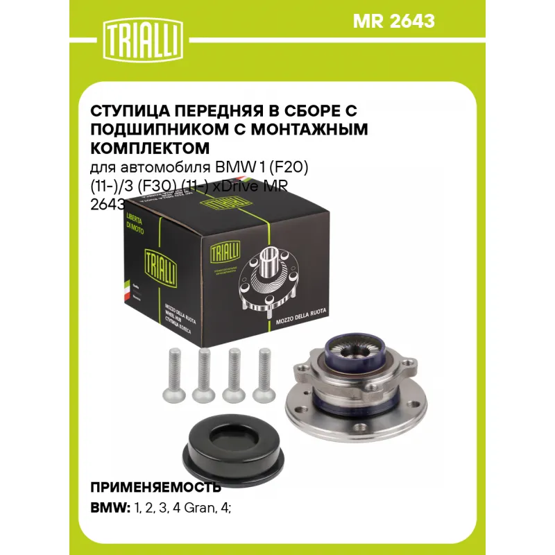 Ступица передняя в сборе с подшипником с монтажным комплектом для автомобиля BMW 1 (F20) (11-)/3 (F30) (11-) xDrive Характеристики: Артикул: MR 2643 OEM номера: 31 20 6 793 898, 31 20 6 867 260, 31 20 6 876 844, 31 20 6 867 840 Товарная линейка: BLACK Количество на автомобиль: 2 Подходящий болт колесный AIRLINE:: ABLT006 Сторона установки: Спереди, слева/справа Высота, мм: 95,8 Внутренний диаметр, мм: 22 Внешний диаметр, мм: 72,5 Особенности конструкции:: С подшипником Количество зубьев: 31 Количество креп. отверстий: 4 Гарантийный срок: 1 год/30 000 км Крепление колёсного диска: M14x1,25 Разболтовка (PCD):: 5x120 Разболтовка (PCD): 5-M14x1.25-120 Комплектация: Ступица - 1 шт Гарантия: от 1 года.