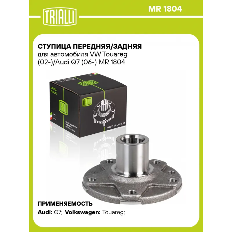 Ступица передняя/задняя для автомобиля VW Touareg (02-)/Audi Q7 (06-) Характеристики: Артикул: MR 1804 OEM номера: 7L0501655A, 7L0501655B, 95534160510 Товарная линейка: BLACK Количество на автомобиль: 4 Подходящий болт колесный AIRLINE:: ABLT004 Сторона установки: Спереди, слева/справа Высота, мм: 94,5 Внутренний диаметр, мм: 51 Внешний диаметр, мм: 154 Особенности конструкции:: Без подшипника Количество зубьев: 30 Сопутствующие товары: Ремонтные комплекты ступицы: CS 1893 Гарантийный срок: 2 года/60 000 км Крепление колёсного диска: M14x1,5 Разболтовка (PCD):: 5x130 Сопутствующие товары:: CS 1893 Разболтовка (PCD): 5-M14x1.5-130 Подходит для авто: Audi Q7 (06-) Volkswagen Touareg (02-) Для проверки применяемости отправьте VIN автомобиля через вкладку "Есть вопросы о товаре?" Комплектация: Ступица - 1 шт Гарантия: от 1 года.