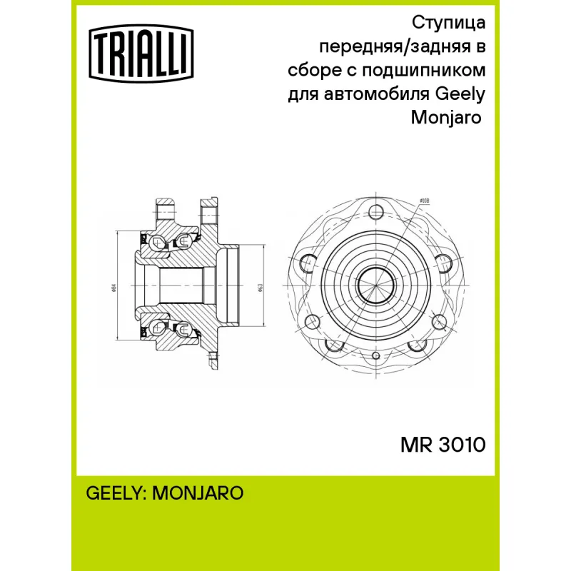 Ступица передняя/задняя в сборе с подшипником для автомобиля Geely Monjaro (21-) Характеристики: Артикул: MR 3010 OEM номера: 4048088300, 8889429327 Количество зубьев: 36 Особенности конструкции:: С подшипником Количество креп. отверстий: 3 Внешний диаметр, мм: 63 Гарантийный срок: 1 года/30 000 км ABS сенсор:: 96 Сторона установки: Спереди/сзади, слева/справа Разболтовка (PCD):: 5x108 Товарная линейка: BLACK Крепление колёсного диска: M14x1,5 Количество на автомобиль: 4 Комплектация: Ступица - 1 шт Гарантия: от 1 года.