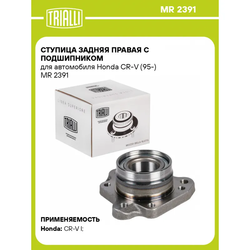 Ступица задняя правая с подшипником для автомобиля Honda CR-V (95-) Характеристики: Артикул: MR 2391 OEM номера: 42200-S10-A01 Товарная линейка: BLACK Парный товар: MR 2390 Количество на автомобиль: 1 Сторона установки: Сзади, справа Высота, мм: 66 Внутренний диаметр, мм: 43 Внешний диаметр, мм: 84 Особенности конструкции:: С по... Читать полностью →