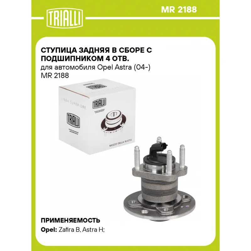 Ступица задняя в сборе с подшипником 4 отв. для автомобиля Opel Astra (04-) Характеристики: Артикул: MR 2188 OEM номера: 1604315, 93178625 Товарная линейка: BLACK Количество на автомобиль: 2 Подходящий болт колесный AIRLINE:: ABLT003 Сторона установки: Сзади, слева/справа Высота, мм: 143,5 Внешний диаметр, мм: 136 Особенности конструкции:: С подшипником Количество креп. отверстий: 4 Гарантийный срок: 1 год/30 000 км Крепление колёсного диска: M12x1,5 Разболтовка (PCD):: 4x100 Разболтовка (PCD): 4-M12x1.5-100 Подходит для авто: Opel Zafira B (05-), Astra H (04-), Zafira B (05-) Для проверки применяемости отправьте VIN автомобиля через вкладку "Есть вопросы о товаре?" Комплектация: Ступица - 1 шт Гарантия: от 1 года.