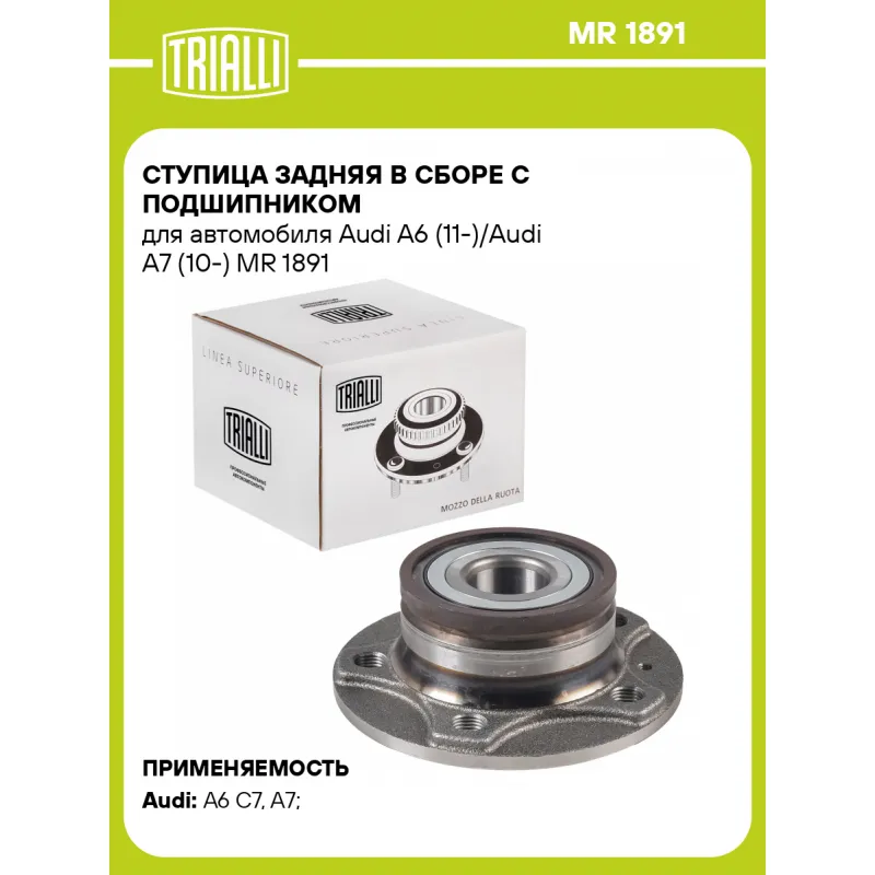 Ступица задняя в сборе с подшипником для автомобиля Audi A6 (11-)/Audi A7 (10-) Характеристики: Артикул: MR 1891 OEM номера: 4G0598611, 4G0 501 611 Товарная линейка: BLACK Количество на автомобиль: 2 Подходящий болт колесный AIRLINE:: ABLT001 Сторона установки: Спереди, слева/справа Высота, мм: 71,3 Внутренний диаметр, мм: 32 Внешний диаметр, мм: 142 Особенности конструкции:: С подшипником Гарантийный срок: 1 год/30 000 км Крепление колёсного диска: M14x1,5 Разболтовка (PCD):: 5x112 Разболтовка (PCD): 5-M14x1,5-112 Подходит для авто: Audi A6 C7 (11-), A7 (10-), A7 (10-) Для проверки применяемости отправьте VIN автомобиля через вкладку "Есть вопросы о товаре?" Комплектация: Ступица - 1 шт Гарантия: от 1 года.