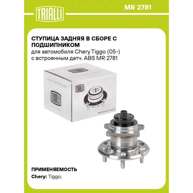 Ступица задняя в сборе с подшипником для автомобиля Chery Tiggo (05-) с встроенным датч. ABS Характеристики: Артикул: MR 2781 OEM номера: T113301210BA Товарная линейка: BLACK Количество на автомобиль: 2 Сторона установки: Сзади, слева/справа Высота, мм: 157,5 Внутренний диаметр, мм: 83,9 Внешний диаметр, мм: 152 Особенности конструкции:: С подшипником Количество креп. отверстий: 4 Гарантийный срок: 1 год/30 000 км Крепление колёсного диска: M12x1,5 Разболтовка (PCD):: 5x114,3 Разболтовка (PCD): 5-M12x1.5-114.3 Подходит для авто: Chery Tiggo (T11) (06-) Для проверки применяемости отправьте VIN автомобиля через вкладку "Есть вопросы о товаре?" Комплектация: Ступица - 1 шт Гарантия: от 1 года.