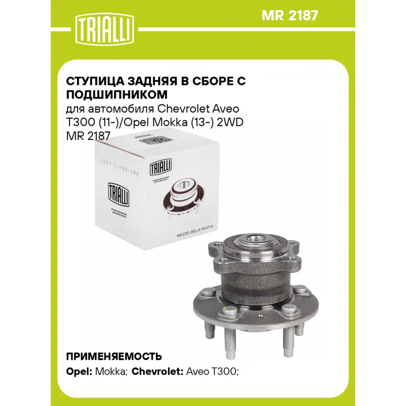 Ступица задняя в сборе с подшипником для автомобиля Chevrolet Aveo T300 (11-)/Opel Mokka (13-) 2WD Характеристики: Артикул: MR 2187 OEM номера: 13500591, 13500592 Товарная линейка: BLACK Количество на автомобиль: 2 Подходящая гайка колесная AIRLINE:: ASCR013, ASCR032, ASCR034 Подходящая шпилька колесная AIRLINE:: ASTD009 Сторона установки: Сзади, слева/справа Высота, мм: 119,5 Внешний диаметр, мм: 136 Особенности конструкции:: С подшипником Количество креп. отверстий: 4 Гарантийный срок: 1 год/30 000 км Крепление колёсного диска: M12x1,5 Разболтовка (PCD):: 5x105 Разболтовка (PCD): 5-M12x1.5x105 Подходит для авто: Opel Mokka (13-) Chevrolet Aveo T300 (11-) Для проверки применяемости отправьте VIN автомобиля через вкладку "Есть вопросы о товаре?" Комплектация: Ступица - 1 шт Гарантия: от 1 года.