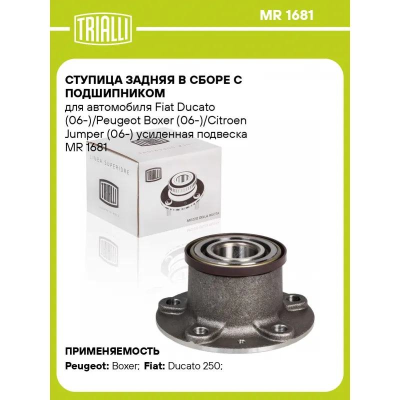 Ступица задняя в сборе с подшипником для автомобиля Fiat Ducato (06-)/Peugeot Boxer (06-)/Citroen Jumper (06-) усиленная подвеска Характеристики: Артикул: MR 1681 OEM номера: 3701.83, 51754941, 71753810 Товарная линейка: BLACK Количество на автомобиль: 2 Сторона установки: Сзади, слева/справа Высота, мм: 94 Внутренний диаметр, мм: 42 Внешний диаметр, мм: 160 Особенности конструкции:: С подшипником Гарантийный срок: 1 год/30 000 км Крепление колёсного диска: M16x1,5 Разболтовка (PCD):: 5x130 Разболтовка (PCD): 5-M16x1.5-130 Подходит для авто: Peugeot Boxer (06-), Boxer (06-) Fiat Ducato 250 (06-) Для проверки применяемости отправьте VIN автомобиля через вкладку "Есть вопросы о товаре?" Комплектация: Ступица - 1 шт Гарантия: от 1 года.
