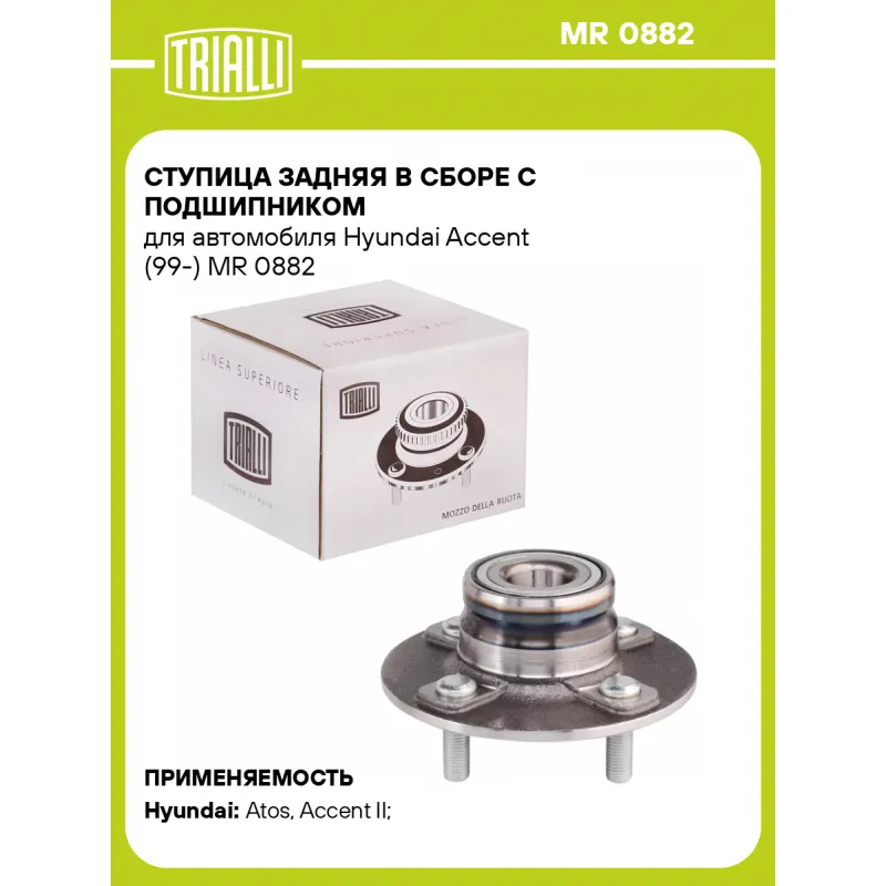 Ступица задняя в сборе с подшипником для автомобиля Hyundai Accent (99-) Характеристики: Артикул: MR 0882 OEM номера: 5271002500, 5271025000, 5271025001, 5271002300 Товарная линейка: BLACK Количество на автомобиль: 2 Подходящая гайка колесная AIRLINE:: ASCR001, ASCR002, ASCR004, ASCR011, ASCR024, ASCR033 Подходящая шпилька колесная AIRLINE:: ASTD001 Сторона установки: Сзади, слева/справа Высота, мм: 64,5 Внутренний диаметр, мм: 28 Внешний диаметр, мм: 139,7 Особенности конструкции:: С подшипником Гарантийный срок: 1 год/30 000 км Крепление колёсного диска: M12x1,5 Разболтовка (PCD):: 4x100 Разболтовка (PCD): 4-M12x1.5-100 Подходит для авто: Hyundai Atos (98-), Accent II (99-) Для проверки применяемости отправьте VIN автомобиля через вкладку "Есть вопросы о товаре?" Комплектация: Ступица - 1 шт Гарантия: от 1 года.