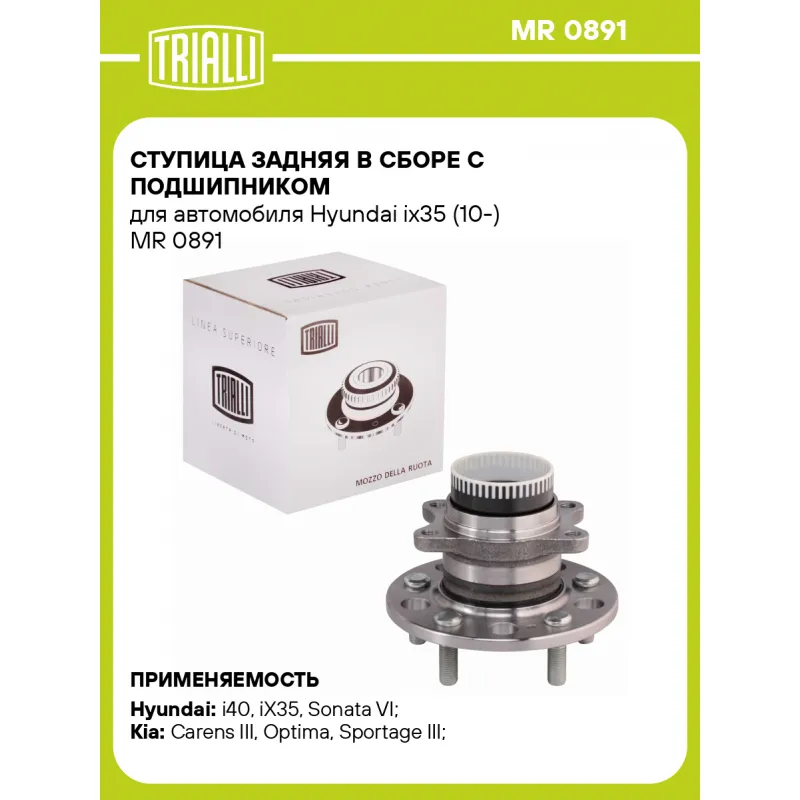 Ступица задняя в сборе с подшипником для автомобиля Hyundai ix35 (10-) Характеристики: Артикул: MR 0891 OEM номера: 52730-3S200, 52730-1D400, S527303S200 Товарная линейка: BLACK Количество на автомобиль: 2 Подходящая гайка колесная AIRLINE:: ASCR001, ASCR002, ASCR011, ASCR024 Подходящая шпилька колесная AIRLINE:: ASTD001, ASTD005 Сторона установки: Сзади, слева/справа Высота, мм: 94,2 Внутренний диаметр, мм: 30 Внешний диаметр, мм: 73 Особенности конструкции:: С подшипником Количество креп. отверстий: 4 Гарантийный срок: 1 год/30 000 км Крепление колёсного диска: M12x1,5 Разболтовка (PCD):: 5x114,3 Разболтовка (PCD): 5 - M12x1.5 - 114.3 Подходит для авто: Hyundai i40 (11-), iX35 (10-), Sonata VI (YF) (10-), Grandeur (11-), iX35 (10-) Kia Carens III (13-), Optima (11-), Sportage III (10-) Для проверки применяемости отправьте VIN автомобиля через вкладку "Есть вопросы о товаре?" Комплектация: Ступица - 1 шт Гарантия: от 1 года.