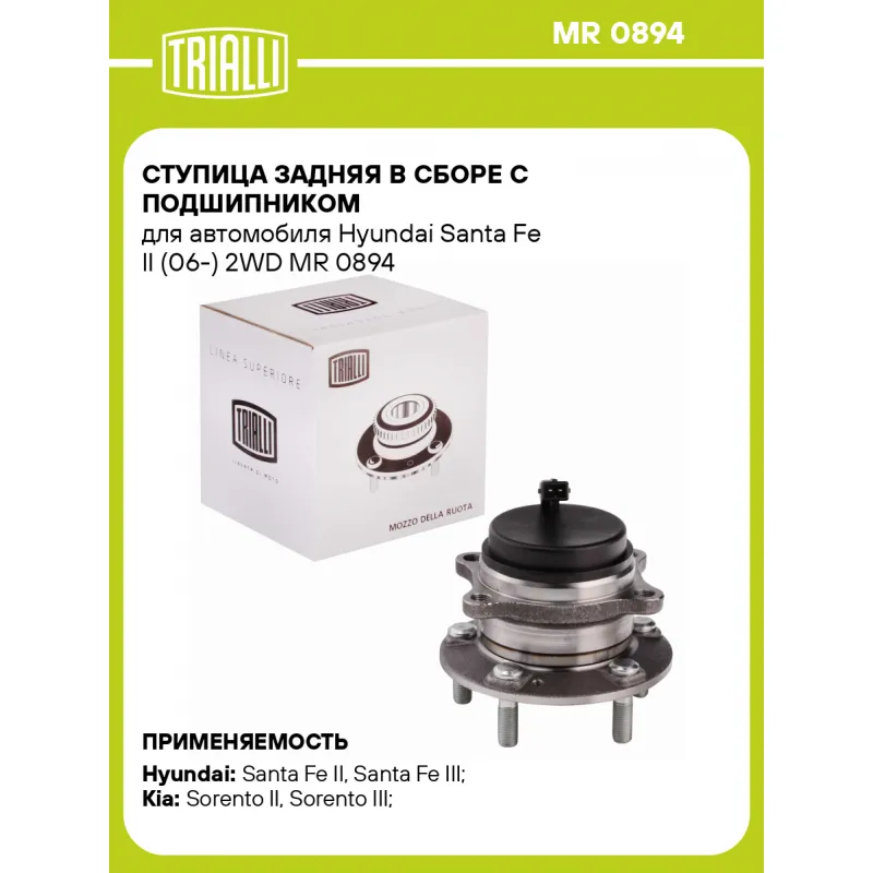 Ступица задняя в сборе с подшипником для автомобиля Hyundai Santa Fe II (06-) 2WD Характеристики: Артикул: MR 0894 OEM номера: 52750-2B100, 517502B100 Товарная линейка: BLACK Количество на автомобиль: 2 Подходящая гайка колесная AIRLINE:: ASCR001, ASCR002, ASCR011, ASCR024 Подходящая шпилька колесная AIRLINE:: ASTD001 Сторона установки: Сзади, слева/справа Высота, мм: 102 Внешний диаметр, мм: 139 Особенности конструкции:: С подшипником Количество креп. отверстий: 4 Гарантийный срок: 1 год/30 000 км Крепление колёсного диска: M12x1,5 Разболтовка (PCD):: 5x114,3 Разболтовка (PCD): 5 - M12x1.5 - 114.3 Подходит для авто: Hyundai Santa Fe II (06-), Santa Fe III (12-) Kia Sorento II (09-), Sorento III (14-) Для проверки применяемости отправьте VIN автомобиля через вкладку "Есть вопросы о товаре?" Комплектация: Ступица - 1 шт Гарантия: от 1 года.