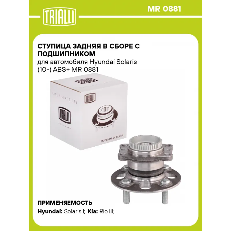 Ступица задняя в сборе с подшипником для автомобиля Hyundai Solaris (10-) ABS+ Характеристики: Артикул: MR 0881 OEM номера: 52750-0U000, 52750-1R000, 52750-4L000, 52750-4L100, S527500U000 Товарная линейка: BLACK Количество на автомобиль: 2 Подходящая гайка колесная AIRLINE:: ASCR001, ASCR002, ASCR004, ASCR011, ASCR024, ASCR033 Подходящая шпилька колесная AIRLINE:: ASTD001, ASTD005 Сторона установки: Сзади, слева/справа Высота, мм: 78 Внешний диаметр, мм: 132 Особенности конструкции:: С подшипником Количество креп. отверстий: 6 Гарантийный срок: 1 год/30 000 км Крепление колёсного диска: M12x1,5 Разболтовка (PCD):: 5x100 Разболтовка (PCD): 5 - M12x1.5 - 100 Подходит для авто: Hyundai Solaris I (10-) Kia Rio III (11-) Для проверки применяемости отправьте VIN автомобиля через вкладку "Есть вопросы о товаре?" Комплектация: Ступица - 1 шт Гарантия: от 1 года.
