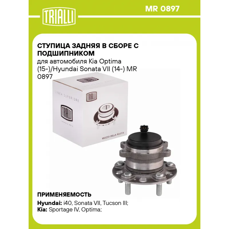 Ступица задняя в сборе с подшипником для автомобиля Kia Optima (15-)/Hyundai Sonata VII (14-) Характеристики: Артикул: MR 0897 OEM номера: 52730-C1100 Товарная линейка: BLACK Количество на автомобиль: 2 Подходящая гайка колесная AIRLINE:: ASCR001, ASCR002, ASCR011, ASCR024 Подходящая шпилька колесная AIRLINE:: ASTD001 Сторона установки: Сзади, слева/справа Высота, мм: 103,9 Внешний диаметр, мм: 143 Особенности конструкции:: С подшипником Количество креп. отверстий: 4 Гарантийный срок: 1 год/30 000 км Крепление колёсного диска: M12x1,5 Разболтовка (PCD):: 5x114,3 Разболтовка (PCD): 5 - M12x1.5 - 114.3 Подходит для авто: Hyundai i40 (11-), Sonata VII (14-), Tucson III (15-) Kia Sportage IV (16-), Optima (15-) Для проверки применяемости отправьте VIN автомобиля через вкладку "Есть вопросы о товаре?" Комплектация: Ступица - 1 шт Гарантия: от 1 года.
