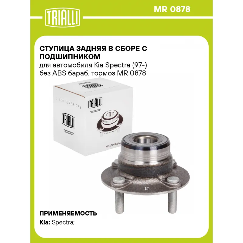 Ступица задняя в сборе с подшипником для автомобиля Kia Spectra (97-) без ABS бараб. тормоз Характеристики: Артикул: MR 0878 OEM номера: 0K202-26150 Товарная линейка: BLACK Количество на автомобиль: 2 Подходящая гайка колесная AIRLINE:: ASCR001, ASCR002, ASCR011, ASCR024 Подходящая шпилька колесная AIRLINE:: ASTD001, ASTD002 Сторона установки: Сзади, слева/справа Высота, мм: 87 Внешний диаметр, мм: 139 Особенности конструкции:: С подшипником Гарантийный срок: 1 год/30 000 км Крепление колёсного диска: M12x1,5 Разболтовка (PCD):: 4x100 Разболтовка (PCD): 4-M12x1.5-100 Подходит для авто: Kia Spectra (00-) Для проверки применяемости отправьте VIN автомобиля через вкладку "Есть вопросы о товаре?" Комплектация: Ступица - 1 шт Гарантия: от 1 года.