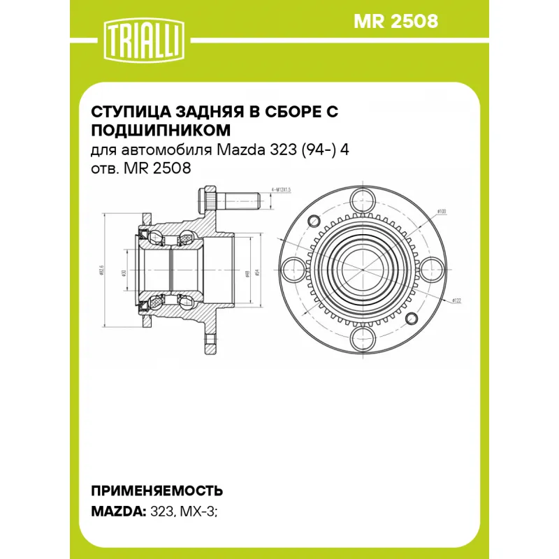 Ступица задняя в сборе с подшипником для автомобиля Mazda 323 (94-) 4 отв. Характеристики: Артикул: MR 2508 OEM номера: B603-26-15XA, B603-26-15XB, B603-26-15XC Количество зубьев: 44 Особенности конструкции:: С подшипником Внешний диаметр, мм: 54 Гарантийный срок: 1 года/30 000 км ABS сенсор:: Нет Сторона установки: Сзади, слева/справа Разболтовка (PCD):: 4x100 Товарная линейка: BLACK Крепление колёсного диска: M12x1,5 Количество на автомобиль: 2 Подходящая гайка колесная AIRLINE:: ASCR001, ASCR004, ASCR011 Подходящая шпилька колесная AIRLINE:: ASTD001, ASTD002 Комплектация: Ступица - 1 шт Гарантия: от 1 года.