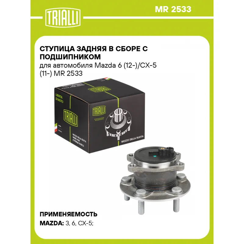 Ступица задняя в сборе с подшипником для автомобиля Mazda 6 (12-)/CX-5 (11-) Характеристики: Артикул: MR 2533 OEM номера: KD31-26-15XA, KD31-26-15XB Товарная линейка: BLACK Количество на автомобиль: 2 Подходящая гайка колесная AIRLINE:: ASCR001, ASCR004, ASCR011 Подходящая шпилька колесная AIRLINE:: ASTD001, ASTD002 Сторона установки: Сзади, слева/справа Высота, мм: 74,3 Внешний диаметр, мм: 83 Особенности конструкции:: С подшипником Количество креп. отверстий: 4 Гарантийный срок: 1 год/30 000 км Крепление колёсного диска: M12x1,5 Разболтовка (PCD):: 5x114,3 Разболтовка (PCD): 5-M12x1.5-114,3 Комплектация: Ступица - 1 шт Гарантия: от 1 года.