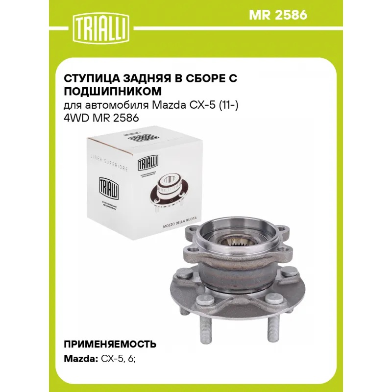 Ступица задняя в сборе с подшипником для автомобиля Mazda CX-5 (11-) 4WD Характеристики: Артикул: MR 2586 OEM номера: KD35-26-15XB, KD35-26-15XC Товарная линейка: BLACK Количество на автомобиль: 2 Подходящая гайка колесная AIRLINE:: ASCR001, ASCR004, ASCR011 Подходящая шпилька колесная AIRLINE:: ASTD001, ASTD002 Сторона установки: Сзади, слева/справа Высота, мм: 100 Внутренний диаметр, мм: 75 Внешний диаметр, мм: 139 Особенности конструкции:: С подшипником Количество зубьев: 28 Количество креп. отверстий: 4 Гарантийный срок: 1 год/30 000 км Крепление колёсного диска: M12x1,5 Разболтовка (PCD):: 5x114,3 Разболтовка (PCD): 5 - M12x1.5 - 114.3 Подходит для авто: Mazda CX-5 (12-), 6 (07-), CX-5 (17-), CX-5 (17-) Для проверки применяемости отправьте VIN автомобиля через вкладку "Есть вопросы о товаре?" Комплектация: Ступица - 1 шт Гарантия: от 1 года.