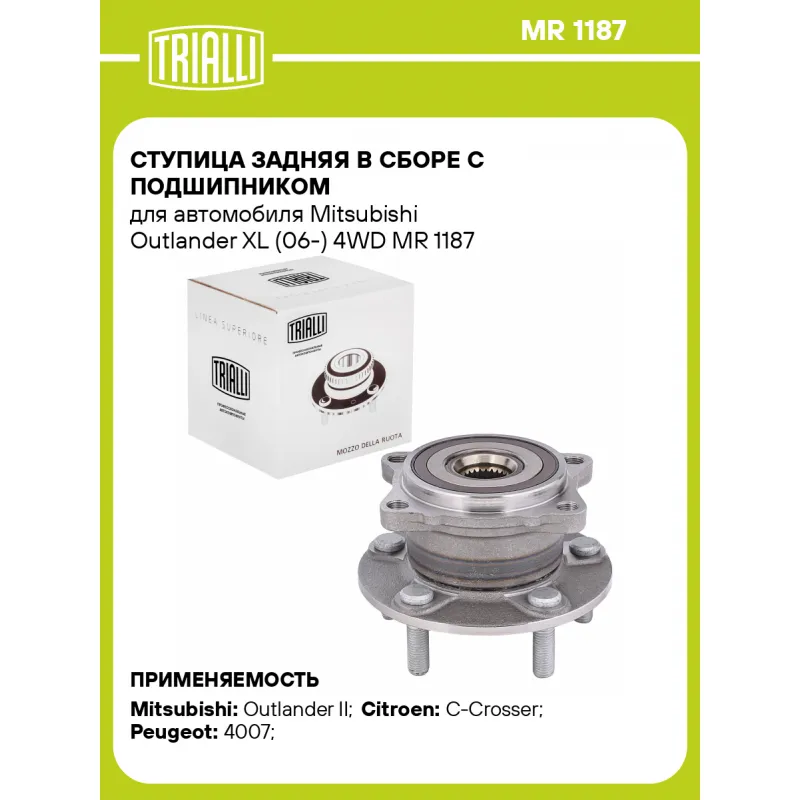 Ступица задняя в сборе с подшипником для автомобиля Mitsubishi Outlander XL (06-) 4WD Характеристики: Артикул: MR 1187 OEM номера: 3785A015, 3785A019, 3730.36 Товарная линейка: BLACK Количество на автомобиль: 2 Подходящая гайка колесная AIRLINE:: ASCR004, ASCR005, ASCR033 Подходящая шпилька колесная AIRLINE:: ASTD001, ASTD005 Сторона установки: Сзади, слева/справа Высота, мм: 103,2 Внутренний диаметр, мм: 28 Внешний диаметр, мм: 140,5 Особенности конструкции:: С подшипником Количество зубьев: 27 Количество креп. отверстий: 4 Гарантийный срок: 1 год/30 000 км Крепление колёсного диска: M12x1,5 Разболтовка (PCD):: 5x114,3 Разболтовка (PCD): 5-M12x1.5-114.3 Подходит для авто: Mitsubishi Outlander II (06-) Citroen C-Crosser (07-), C-Crosser (07-) Peugeot 4007 (07-) Для проверки применяемости отправьте VIN автомобиля через вкладку "Есть вопросы о товаре?" Комплектация: Ступица - 1 шт Гарантия: от 1 года.
