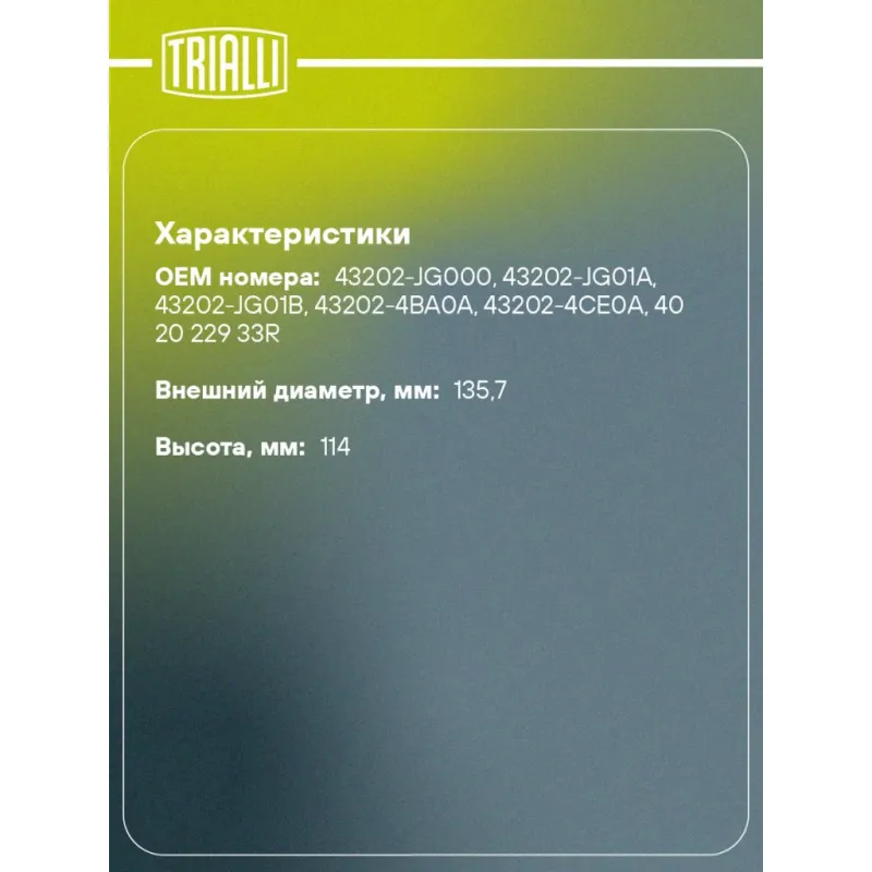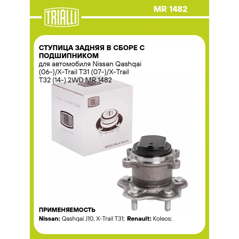 Ступица задняя в сборе с подшипником для автомобиля Nissan Qashqai (06-)/X-Trail T31 (07-)/X-Trail T32 (14-) 2WD Характеристики: Артикул: MR 1482 OEM номера: 43202-JG000, 43202-JG01A, 43202-JG01B, 43202-4BA0A, 43202-4CE0A, 40 20 229 33R Товарная линейка: BLACK Количество на автомобиль: 2 Подходящая гайка колесная AIRLINE:: ASCR008, ASCR018, ASCR027 Подходящая шпилька колесная AIRLINE:: ASTD003 Сторона установки: Сзади, слева/справа Высота, мм: 114 Внешний диаметр, мм: 135,7 Особенности конструкции:: С подшипником Количество креп. отверстий: 4 Гарантийный срок: 1 год/30 000 км Крепление колёсного диска: M12x1,25 Разболтовка (PCD):: 5x114,3 Разболтовка (PCD): 5-M12x1.25-114.3 Подходит для авто: Nissan Qashqai J10 (06-), Qashqai J10 (06-), X-Trail T31 (07-) Renault Koleos (08-), Koleos (08-) Для проверки применяемости отправьте VIN автомобиля через вкладку "Есть вопросы о товаре?" Комплектация: Ступица - 1 шт Гарантия: от 1 года.
