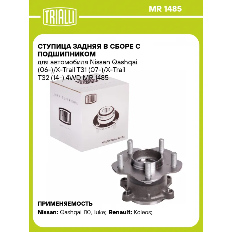 Ступица задняя в сборе с подшипником для автомобиля Nissan Qashqai (06-)/X-Trail T31 (07-)/X-Trail T32 (14-) 4WD Характеристики: Артикул: MR 1485 OEM номера: 43202-EN100, 43202-EN11A, 43202-JG200, 43202-JG21A, 43202-JY00A, 43202-JY30A, 43202-4BA0B, 402027585R, 43202JY30, 43202-4BF0A Товарная линейка: BLACK Количество на автомобиль: 2 Подходящая гайка колесная AIRLINE:: ASCR008, ASCR018, ASCR027 Подходящая шпилька колесная AIRLINE:: ASTD003 Сторона установки: Сзади, слева/справа Высота, мм: 95 Внутренний диаметр, мм: 26,5 Внешний диаметр, мм: 148 Особенности конструкции:: С подшипником Количество зубьев: 25 Количество креп. отверстий: 4 Гарантийный срок: 1 год/30 000 км Крепление колёсного диска: M12x1,25 Разболтовка (PCD):: 5x114,3 Разболтовка (PCD): 5-M12x1.25-114.3 Подходит для авто: Nissan Qashqai J10 (06-), Juke (10-), Qashqai J10 (06-), X-Trail T31 (07-), Juke (10-) Renault Koleos (08-), Koleos (08-) Для проверки применяемости отправьте VIN автомобиля через вкладку "Есть вопросы о товаре?" Комплектация: Ступица - 1 шт Гарантия: от 1 года.