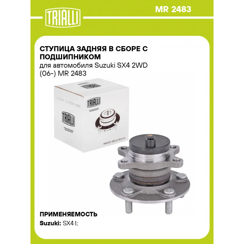 Ступица задняя в сборе с подшипником для автомобиля Suzuki SX4 2WD (06-) Характеристики: Артикул: MR 2483 OEM номера: 43402-80J00, 43402-80J01, 43402-80J02 Товарная линейка: BLACK Количество на автомобиль: 2 Подходящая гайка колесная AIRLINE:: ASCR023, ASCR030 Сторона установки: Сзади, слева/справа Высота, мм: 101 Внутренний диаметр, мм: 72 Внешний диаметр, мм: 140 Особенности конструкции:: С подшипником Количество креп. отверстий: 4 Гарантийный срок: 1 год/30 000 км Крепление колёсного диска: M12x1,25 Разболтовка (PCD):: 5x114,3 Разболтовка (PCD): 5-M12x1.25-114,3 Подходит для авто: Suzuki SX4 I (06-) Для проверки применяемости отправьте VIN автомобиля через вкладку "Есть вопросы о товаре?" Комплектация: Ступица - 1 шт Гарантия: от 1 года.
