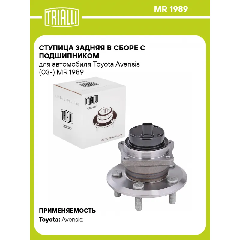 Ступица задняя в сборе с подшипником для автомобиля Toyota Avensis (03-) Характеристики: Артикул: MR 1989 OEM номера: 42450-05040, 42450-32040, 42450-32041, 42450-47030, 42450-63011 Товарная линейка: BLACK Количество на автомобиль: 2 Подходящая гайка колесная AIRLINE:: ASCR001, ASCR002, ASCR004, ASCR005, ASCR009 Подходящая шпилька колесная AIRLINE:: ASTD002 Сторона установки: Сзади, слева/справа Высота, мм: 99 Внутренний диаметр, мм: 74 Внешний диаметр, мм: 135 Особенности конструкции:: С подшипником Количество креп. отверстий: 4 Гарантийный срок: 1 год/30 000 км Крепление колёсного диска: M12x1,5 Разболтовка (PCD):: 5x100 Разболтовка (PCD): 5-M12x1.5-100 Подходит для авто: Toyota Avensis (03-), Avensis (03-), Avensis (03-) Для проверки применяемости отправьте VIN автомобиля через вкладку "Есть вопросы о товаре?" Комплектация: Ступица - 1 шт Гарантия: от 1 года.