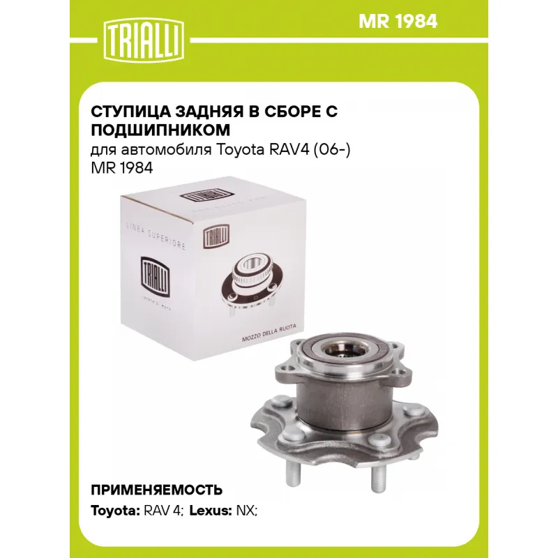 Ступица задняя в сборе с подшипником для автомобиля Toyota RAV4 (06-) Характеристики: Артикул: MR 1984 OEM номера: 42410-42040, 42410-0R010 Товарная линейка: BLACK Количество на автомобиль: 2 Подходящая гайка колесная AIRLINE:: ASCR001, ASCR002, ASCR004, ASCR005 Подходящая шпилька колесная AIRLINE:: ASTD002 Сторона установки: Сзади, слева/справа Высота, мм: 82,4 Внутренний диаметр, мм: 26 Внешний диаметр, мм: 152 Особенности конструкции:: С подшипником Количество зубьев: 26 Количество креп. отверстий: 4 Гарантийный срок: 1 год/30 000 км Крепление колёсного диска: M12x1,5 Разболтовка (PCD):: 5x114,3 Разболтовка (PCD): 5-M12x1.5-114.3 Подходит для авто: Toyota RAV 4 (06-), RAV 4 (13-), RAV 4 (06-) Lexus NX (14-) Для проверки применяемости отправьте VIN автомобиля через вкладку "Есть вопросы о товаре?" Комплектация: Ступица - 1 шт Гарантия: от 1 года.