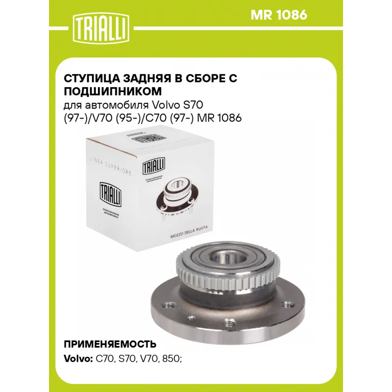 Ступица задняя в сборе с подшипником для автомобиля Volvo S70 (97-)/V70 (95-)/C70 (97-) Характеристики: Артикул: MR 1086 OEM номера: 271795, 2715852, 2717950, 2717957, 77431795 Товарная линейка: BLACK Количество на автомобиль: 2 Сторона установки: Сзади, слева/справа Высота, мм: 71 Внутренний диаметр, мм: 30 Внешний диаметр, мм: 135,8 Особенности конструкции:: С подшипником Гарантийный срок: 1 год/30 000 км Крепление колёсного диска: M12x1,75 Разболтовка (PCD):: 5x108 Разболтовка (PCD): 5-M12x1.75-108 Подходит для авто: Volvo C70 (97-), S70 (96-), V70 (97-), 850 (91-) Для проверки применяемости отправьте VIN автомобиля через вкладку "Есть вопросы о товаре?" Комплектация: Ступица - 1 шт Гарантия: от 1 года.