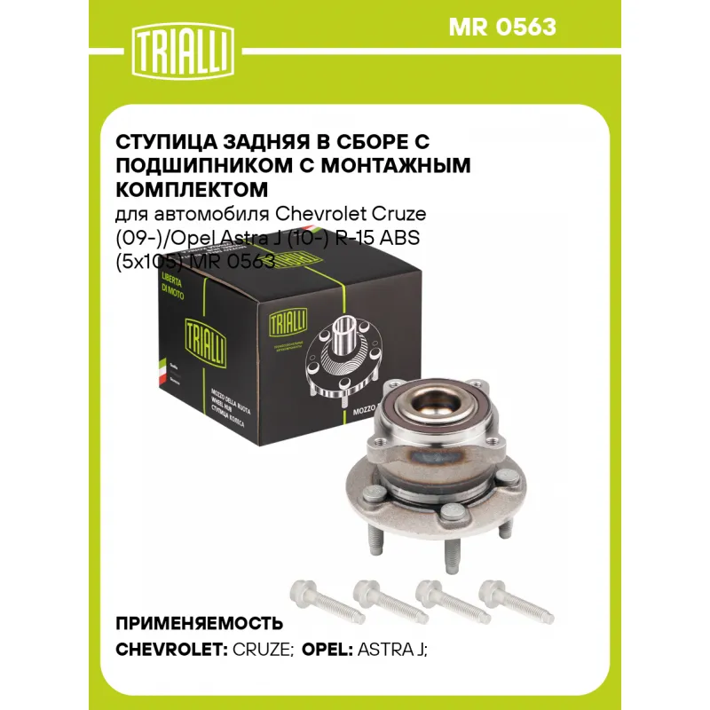 Ступица задняя в сборе с подшипником с монтажным комплектом для автомобиля Chevrolet Cruze (09-)/Opel Astra J (10-) R-15 ABS (5x105) Характеристики: Артикул: MR 0563 OEM номера: 328002, 13502872, 13591998, 11588742 Товарная линейка: BLACK Количество на автомобиль: 2 Подходящая гайка колесная AIRLINE:: ASCR032 Подходящая шпилька колесная AIRLINE:: ASTD009 Сторона установки: Сзади, слева/справа Высота, мм: 96 Внутренний диаметр, мм: 29 Внешний диаметр, мм: 136 Особенности конструкции:: С подшипником Количество креп. отверстий: 4 Гарантийный срок: 1 год/30 000 км Крепление колёсного диска: M12x1,5 Разболтовка (PCD):: 5x105 Разболтовка (PCD): 5-M12x1.5-105 Комплектация: Болт - 4 шт Ступица - 1 шт Гарантия: от 1 года.